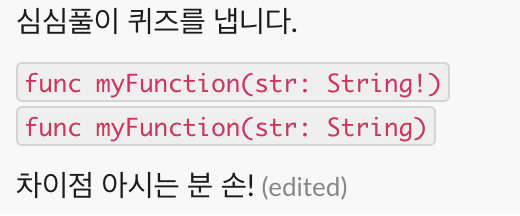 며칠 전 저희 슬랙 방에서 String, String?, String! 에 대한 팝업 퀴즈가 있었습니다.