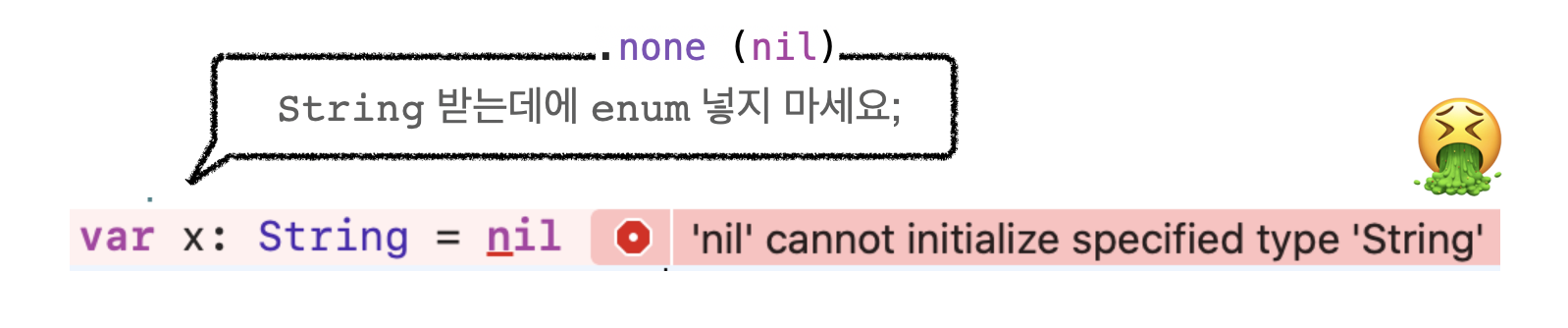 그렇다면 위에서 봤던 var x: String = nil 이 왜 에러 상황인지 x의 입장에서 다시 한번 생각해봅시다.