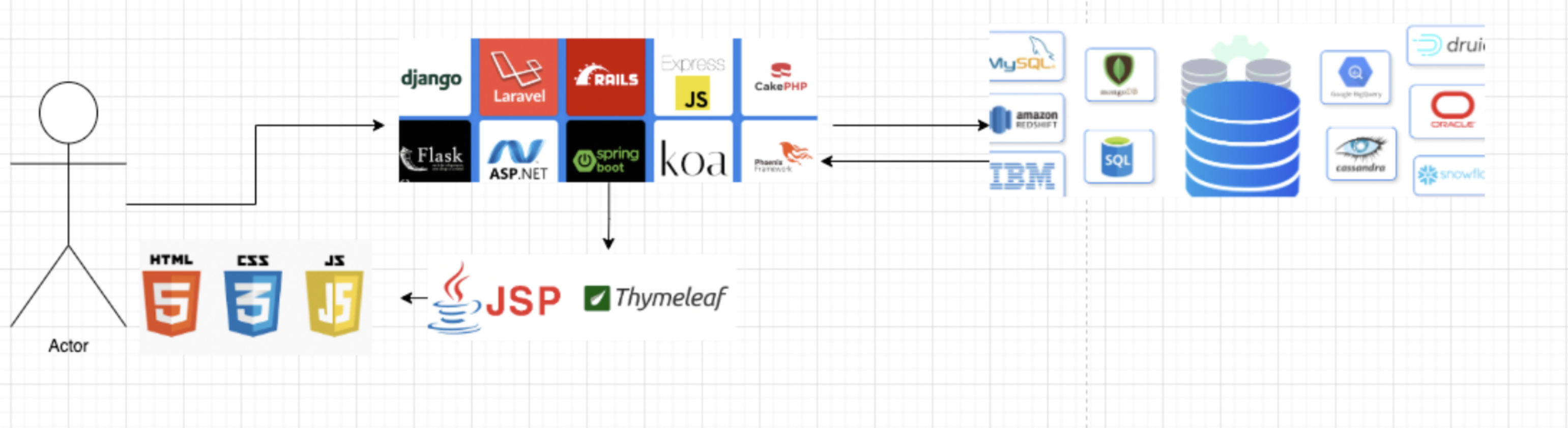 서버 랜더링에 익숙한 백엔드 개발자들은 기존 웹 개발 방식을 다음 그림과 같이 알고 있을 겁니다. . 예를 들어, 스프링 부트와 같은 백엔드 프레임워크를 사용할 때, API 요청(@RestController)과 프론트 페이지(@Controller)의 구성 및 요청에 중점을 두고, 동적인 데이터를 HTML에 삽입하는 방식을 활용합니다.