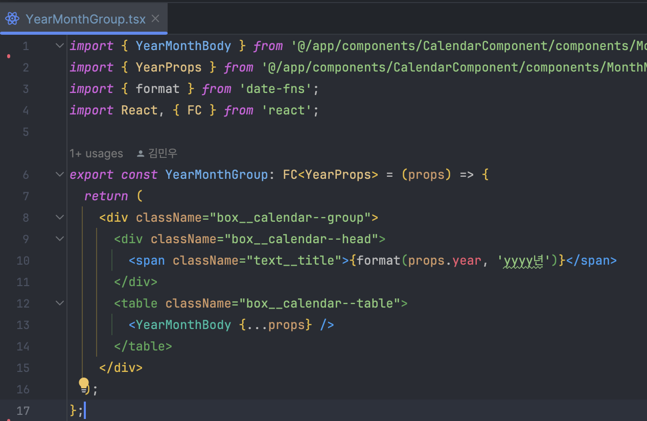 앞서 언급했듯이, 캘린더 컴포넌트는 여러 곳에서 재사용될 필요가 있습니다. 이를 위해, 캘린더의 구성 요소들, 예를 들어 Table, Group, Title, Header, Cell 등도 재사용 가능해야 합니다. 이러한 요소들은 각각 독립적인 작은 컴포넌트로 제작되어야 합니다.