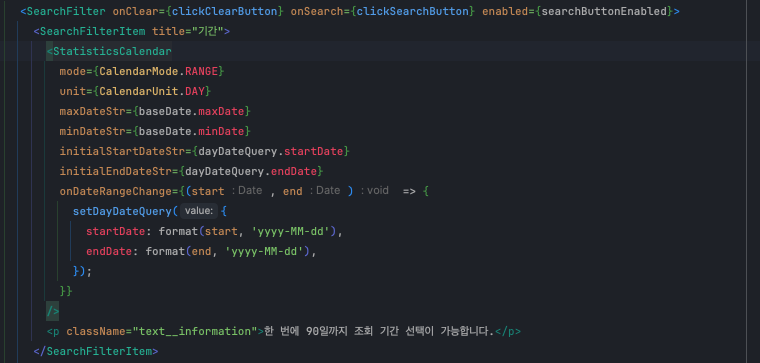 캘린더 컴포넌트는 SearchInput과 유사한 역할을 하며, 상위 컴포넌트에서 API 호출 시 필요한 날짜 범위와 같은 파라미터를 state로 관리합니다. 캘린더 내부에서 setState를 통해 페이지의 state를 변경하면, 이에 따라 리렌더링되고, 이는 다시 하위의 Table 컴포넌트가 state에 따라 결과값을 새롭게 표시하게 합니다. 상수 값은 페이지에서 props로 직접 전달됩니다.