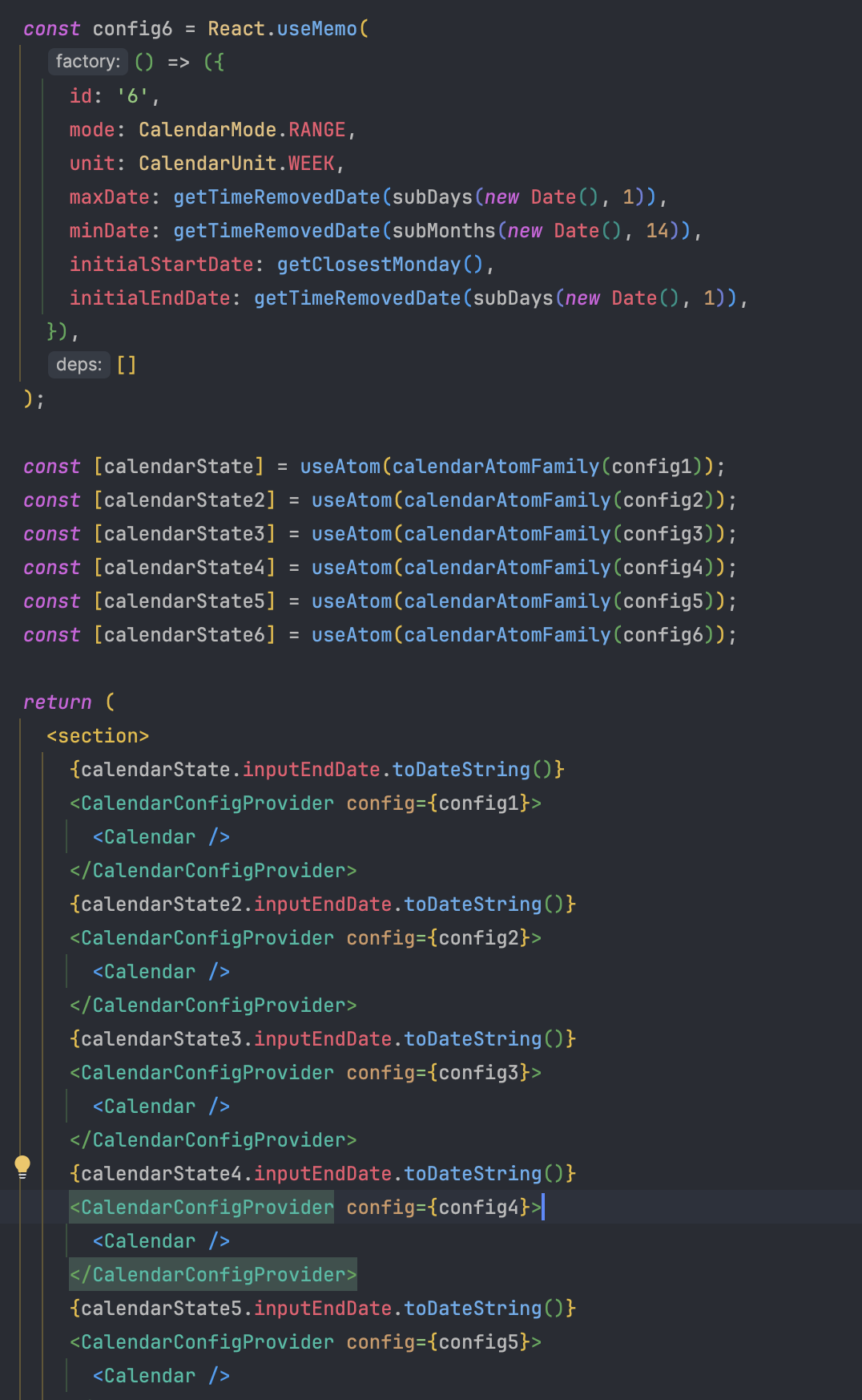 캘린더를 초기화할 때, API로부터 받은 최대 선택 가능 일자(maxDate, minDate)와 시작일, 종료일을 설정해야 합니다. Jotai Atom은 초기에 상수 값을 요구하기 때문에, 더미 데이터를 넣은 후 변경해야 합니다. 이는 초기 랜더링 시 불필요한 랜더링을 초래할 수 있습니다. 이 문제는 atomFamily를 사용하여 매개변수로 값을 받을 수 있게 하여 해결했습니다.