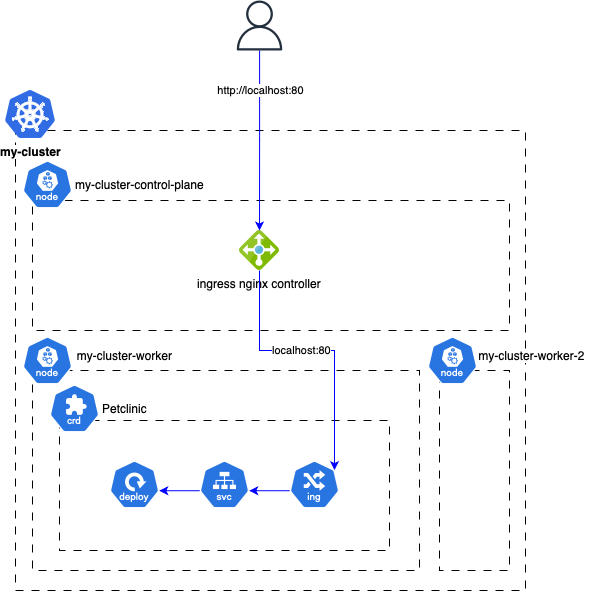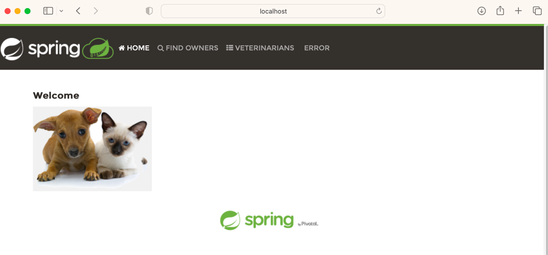 2024-02-07T04:28:42Z INFO Ingress 생성 {"controller": "petclinic", "controllerGroup": "spring.my.domain", "controllerKind": "Petclinic", "Petclinic": {"name":"petclinic-sample","namespace":"default"}, "namespace": "default", "name": "petclinic-sample", "reconcileID": "a5206c8a-fe44-4ebe-9af3-2dc0f95e211c"}브라우저에 http://localhost 로 접속하여 petclinic 메인 화면이 나오는지 확인합니다.