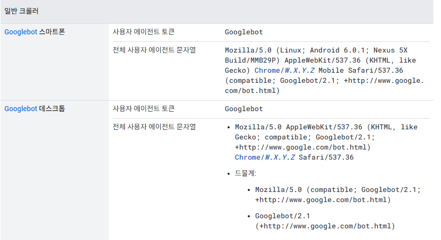 구글 봇의 경우 공식 홈페이지에 userAgent가 기록이 되어있습니다.