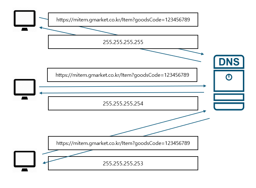 하나의 서비스를 운영하는 분산된 각 서버의 ipAddress 주소를 DNS에 하나의 도메인 이름으로 등록하면 클라이언트는 DNS에 해당 도메인 이름으로 요청할 경우 등록된 각 서버의 ipAddress주소를 순환하여 반환하는 방식입니다.