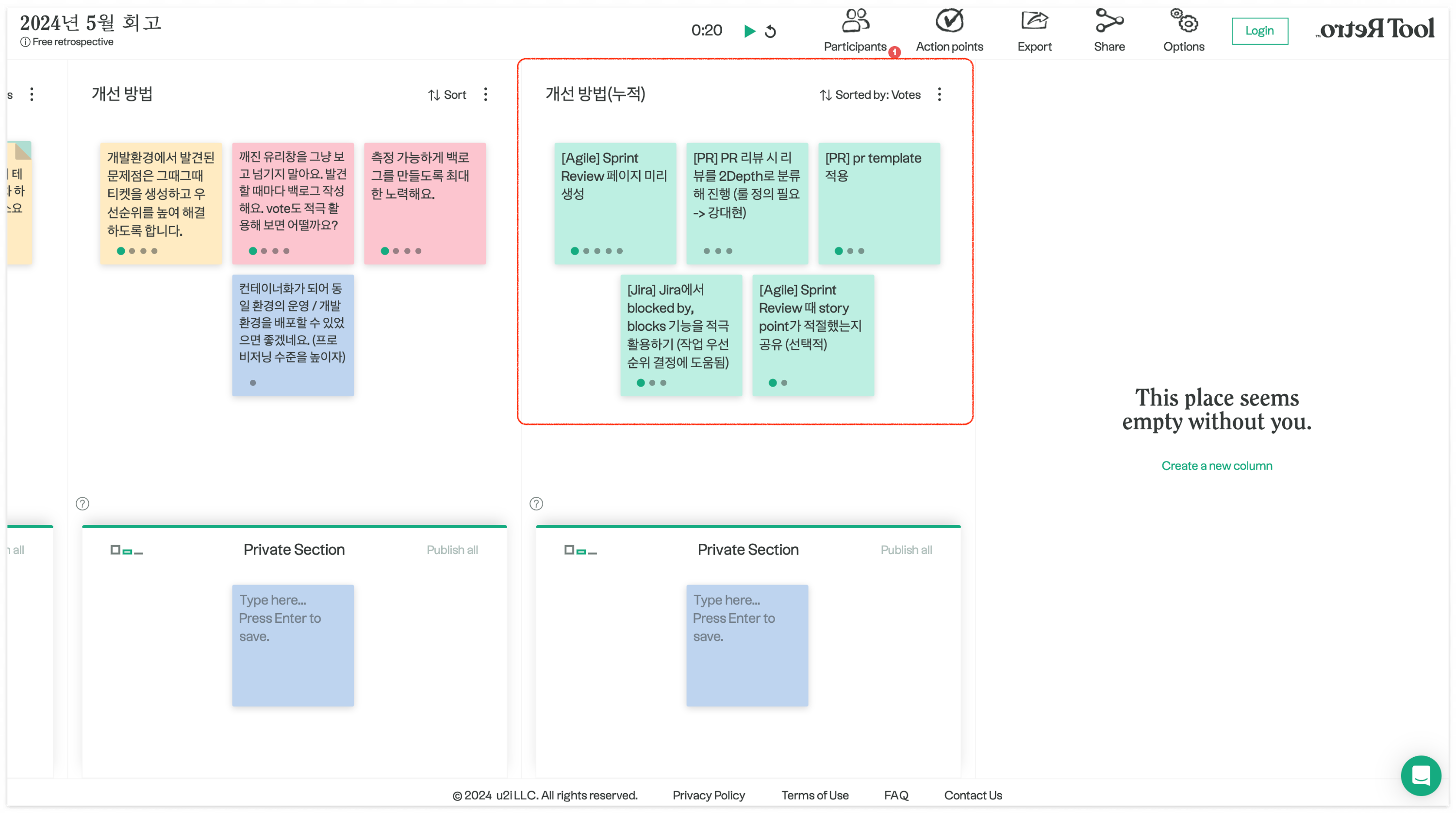 회고 진행자는 retrotool 에서 아래 칼럼을 생성하여 회고를 준비합니다.