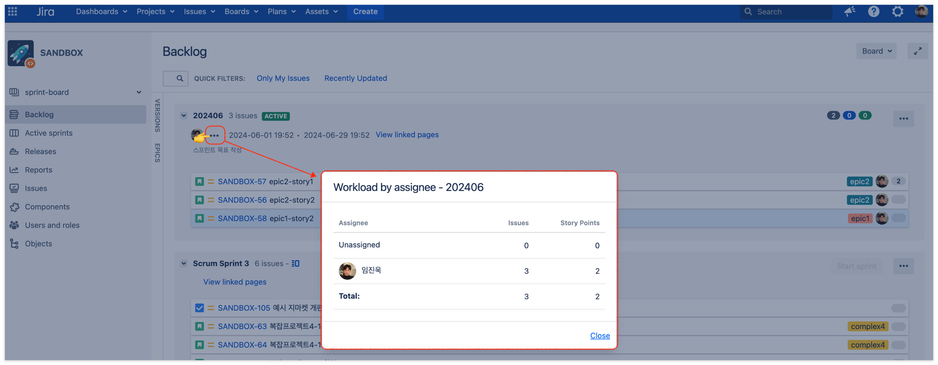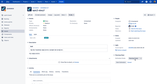 이슈 담당자까지 지정이 완료되고 나면 프로젝트 관리자는 달성가능한 '스토리 포인트'가 할당된 지 확인하고 스프린트를 시작합니다.