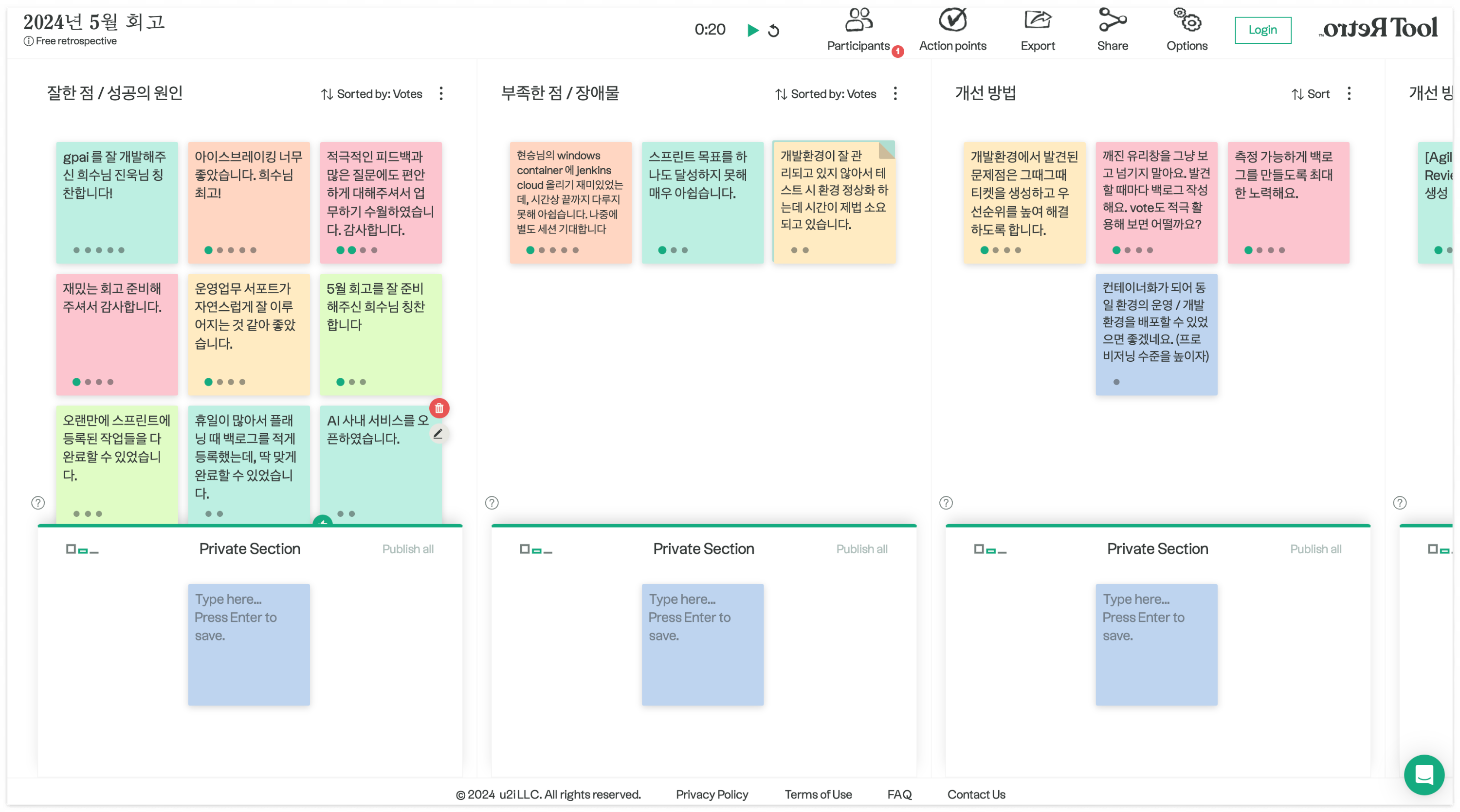 회고 툴은 회고 진행자가 전적으로 준비해오고 있습니다. 고정된 툴을 사용해야 하는 것도 아닙니다. 회고 툴을 사용한 것 중, 제일 좋았던 툴은 retrotool 입니다.