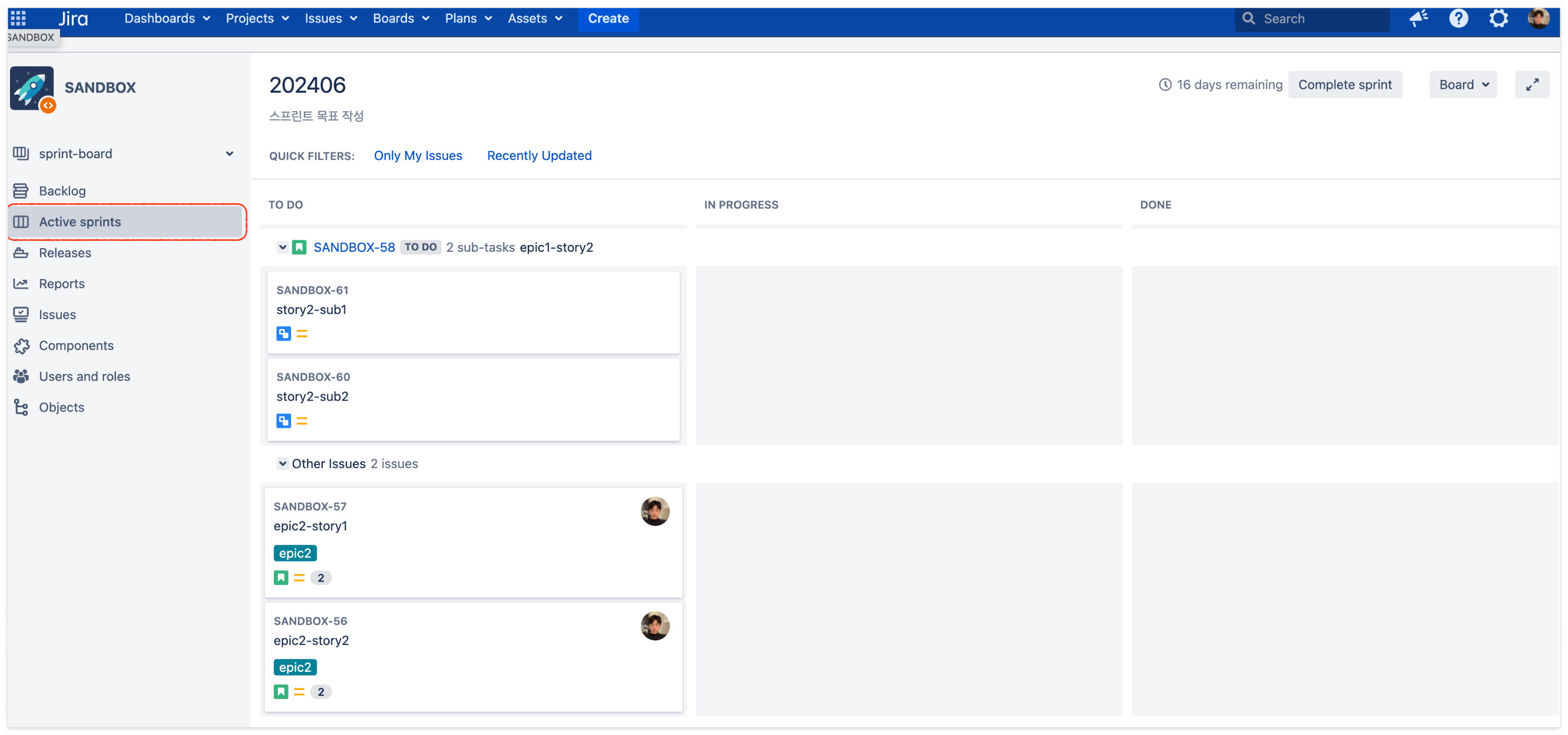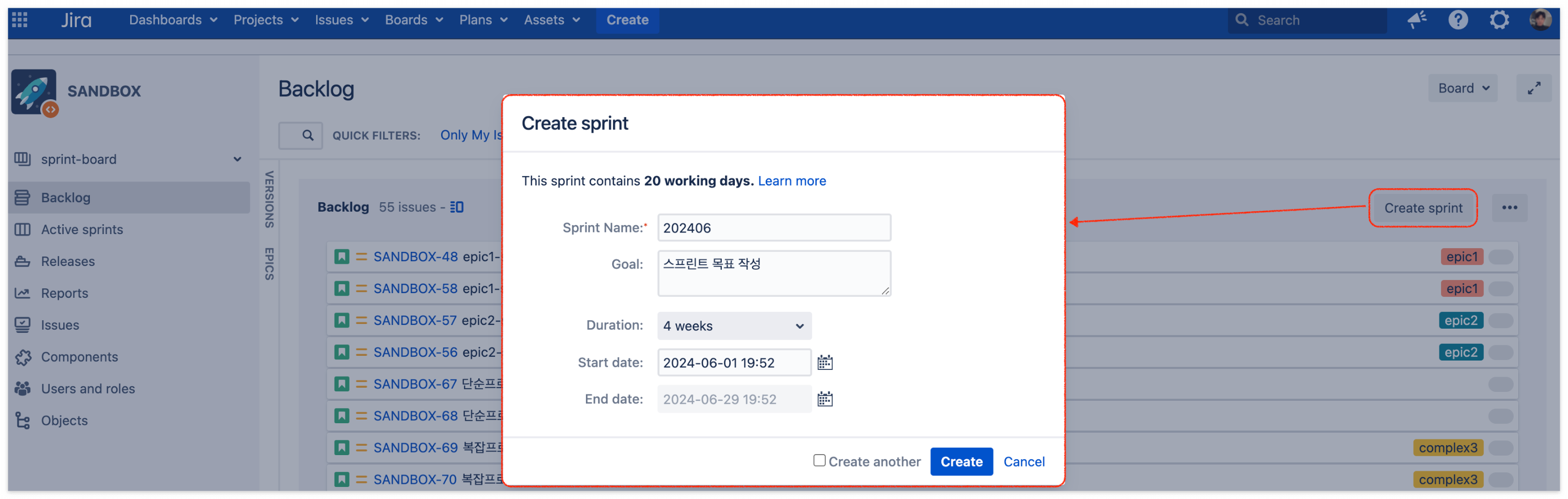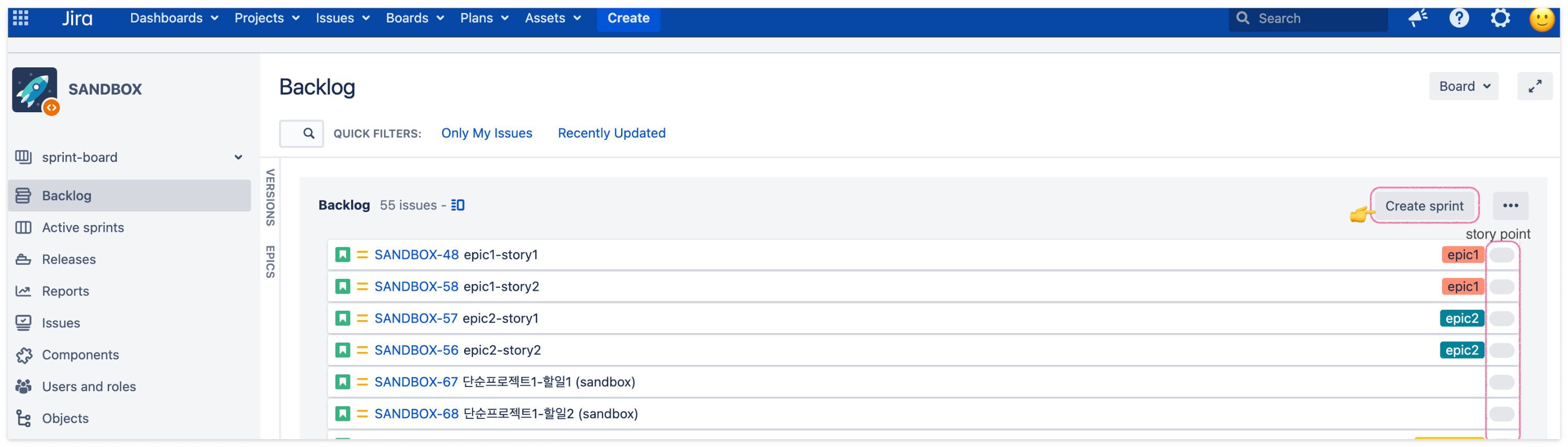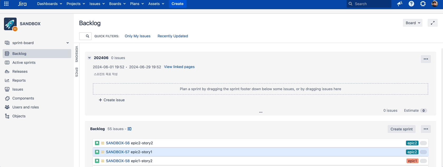 Jira board에서 스프린트가 생성되면 해당 스프린트에서 달성해야 하는 목표에 맞는 백로그를 스프린트에 등록하면 '스프린트 플래닝'을 위한 준비가 됩니다.