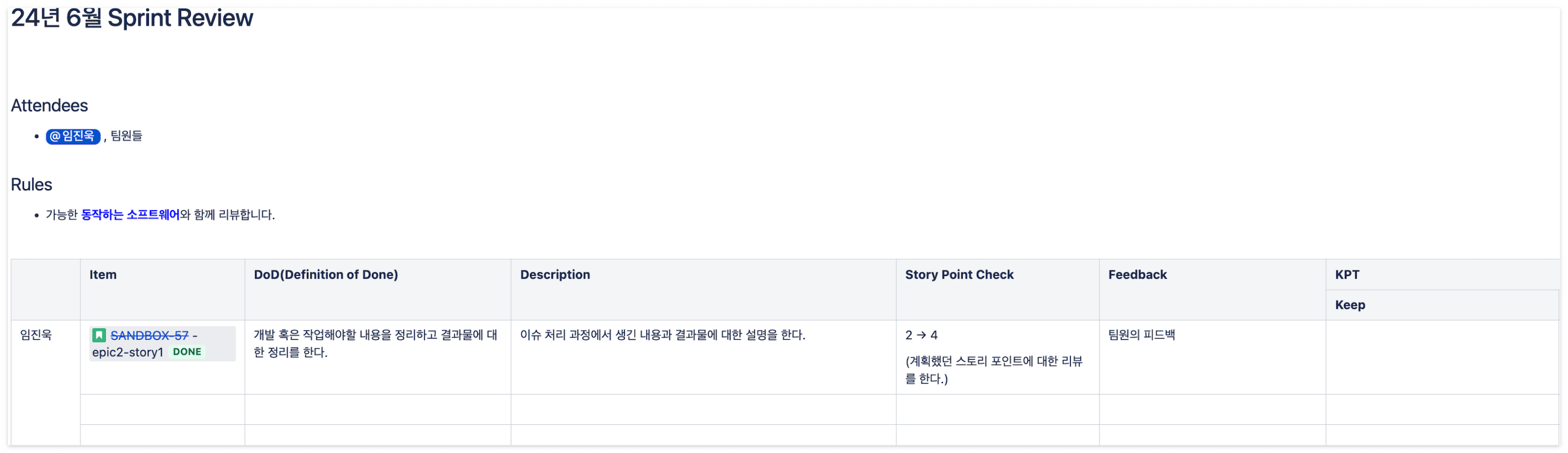 저희가 하는 것 중, 특이점은 "Story Point Check" 항목이 있는데, 스프린트 회고 때 나온 의견의 결과물로 스토리 포인트를 잘 설정하기 위하여 스프린트 리뷰 때, 설정한 스토리 포인트와 실제 본인이 작업하며 느낀 스토리 포인트에 대한 확인을 하고 있습니다. (선택적으로 하고 싶은 사람만 하고 있습니다)