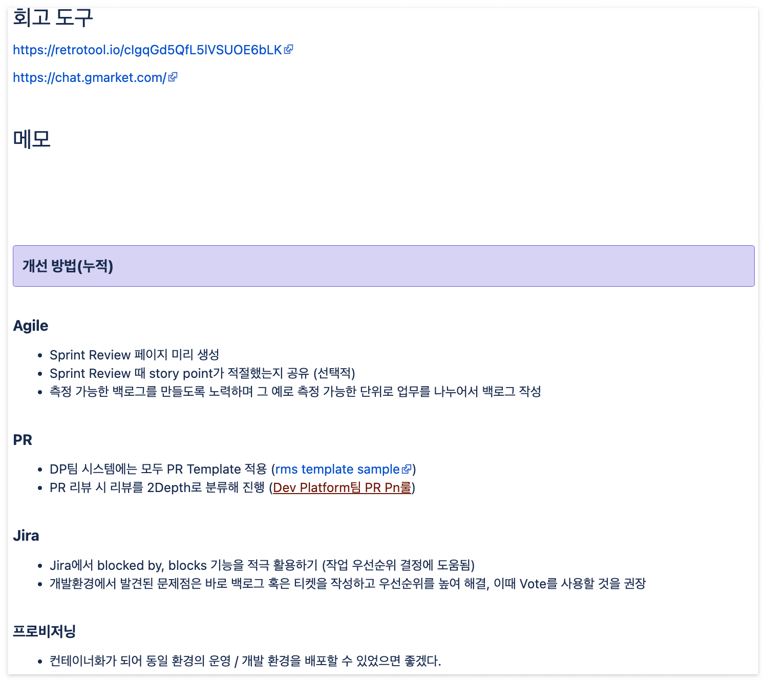 잘한 점과 부족한 점에 대한 공유가 끝나면, 팀원들이 '5분'간 각자 개선점을 작성합니다. 개선점 작성이 끝나면 진행자는 개선점을 공유합니다. 누적된 개선 사항 중, 이미 문화로 정착되었거나 불필요하다고 느낄 경우 '졸업'을 시키고, 새로운 개선 사항을 추가해 줍니다. 회고에서 나온 개선사항은 언제든 팀원들이 볼 수 있는 공간에 정리해 둡니다. (저희의 경우 주간회의록 제일 상단에 정리해 둡니다.)