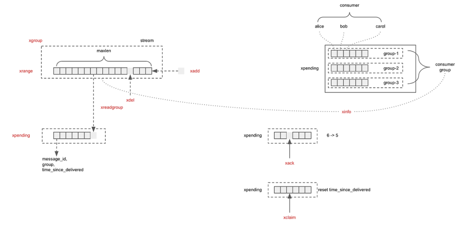 반면, Redis Stream은 휘발성이 아니라 Kafka의 offset 개념처럼 마지막으로 수신한 record id를 저장하고 XADD, XREADGROUP, XACK, XPENDING, XCLAIM으로 이어지는 처리 프로세스를 통해 메시지를 컨트롤할 수 있는 다양한 방법을 제공합니다.