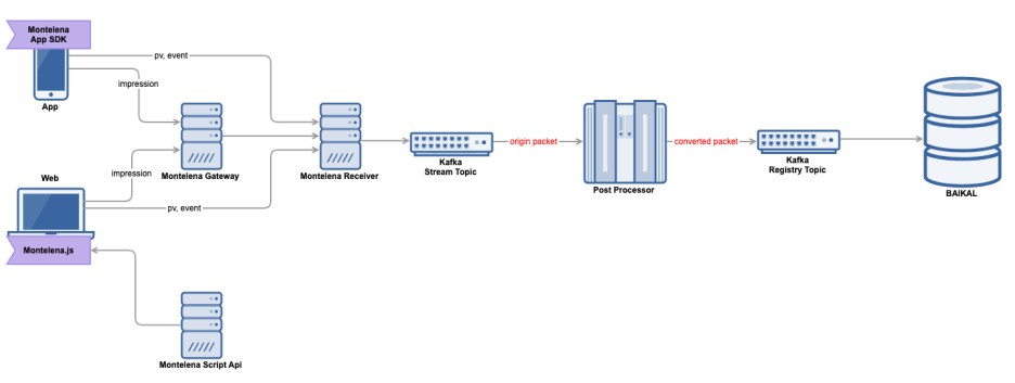 저희 팀에서는 User의 행동 정보를 수집하는 프레임워크 중 하나인 montelena receiver를 통해 수집한 데이터 (view, event, impression 등)를 post Processor라는 데이터 파이프라인 application을 통해 적재, 가공해서 각종 지표 트래킹 및 분석에 활용할 수 있도록 제공하고 있습니다.