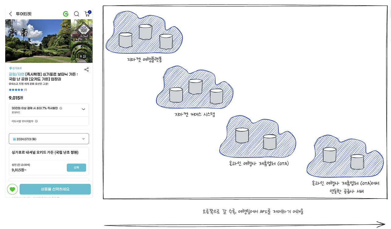 여행 상품 상세 페이지는 지마켓 여행 플랫폼, 지마켓 커머스 시스템, OTA (온라인 여행사 제휴업체) 서버의 API를 조합하여 기능을 제공합니다. 한 화면에서 사용하는 API의 수만 10개 이상이고, 이를 책임지는 팀과 회사도 다양합니다.
