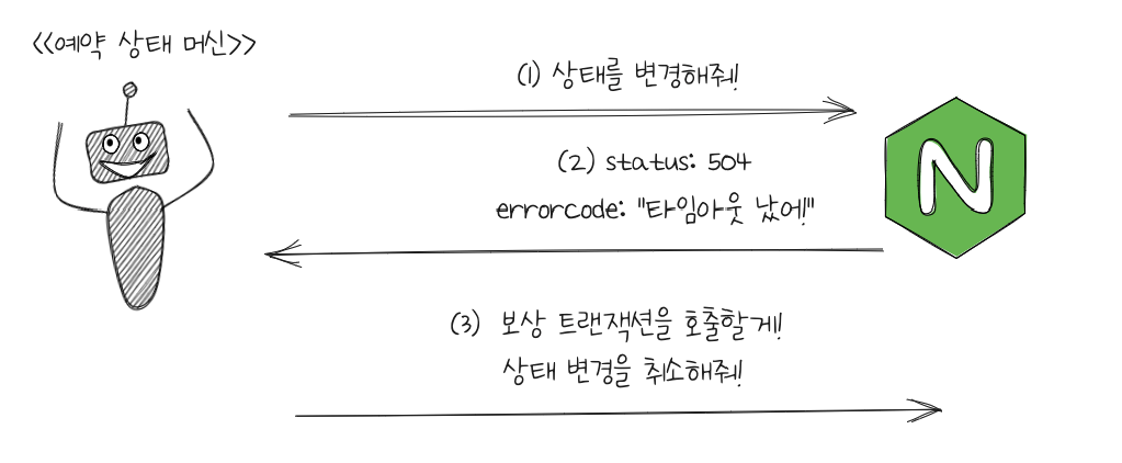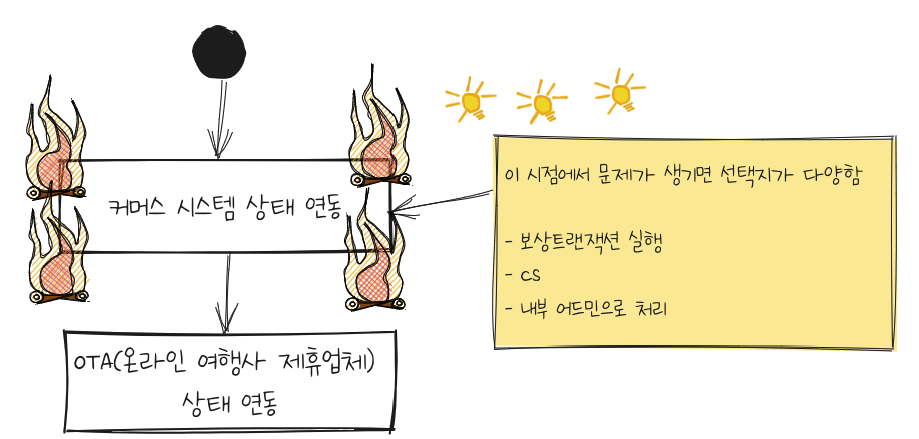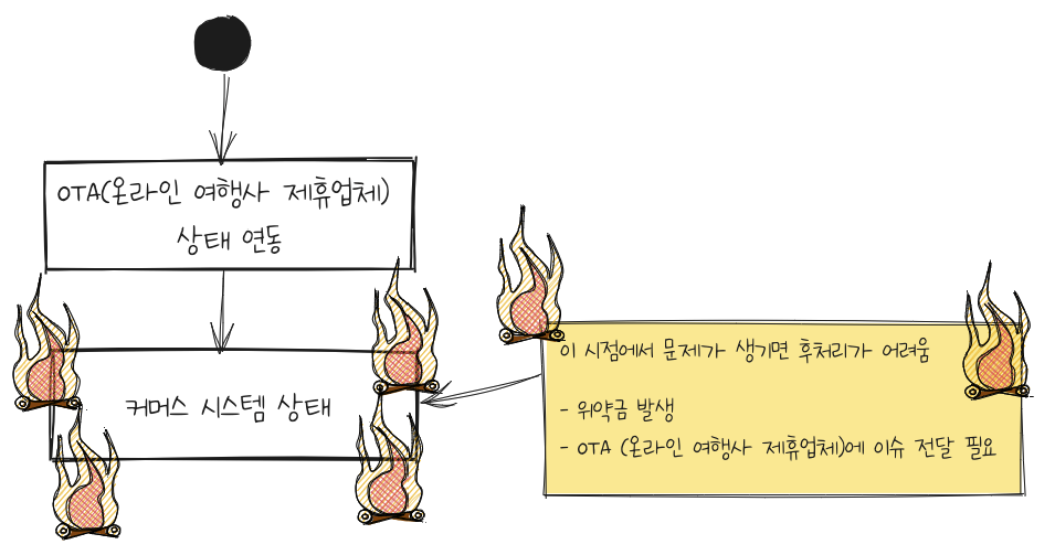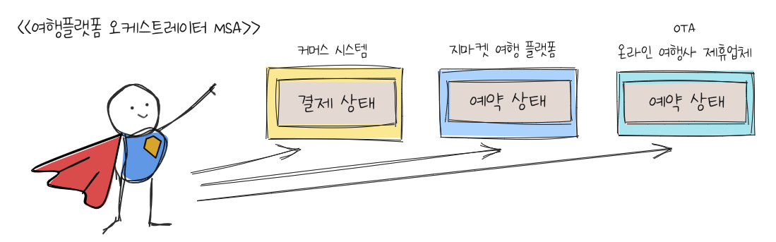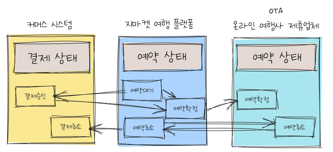 각 시스템은 자신만의 고유한 상태를 지닙니다. 그리고 각 상태는 결제, 대금정산, 여행 서비스 제공 등의 기반 데이터로 사용됩니다. 그래서 세 개의 시스템은 일관된 상태로 동기화되어야 합니다.