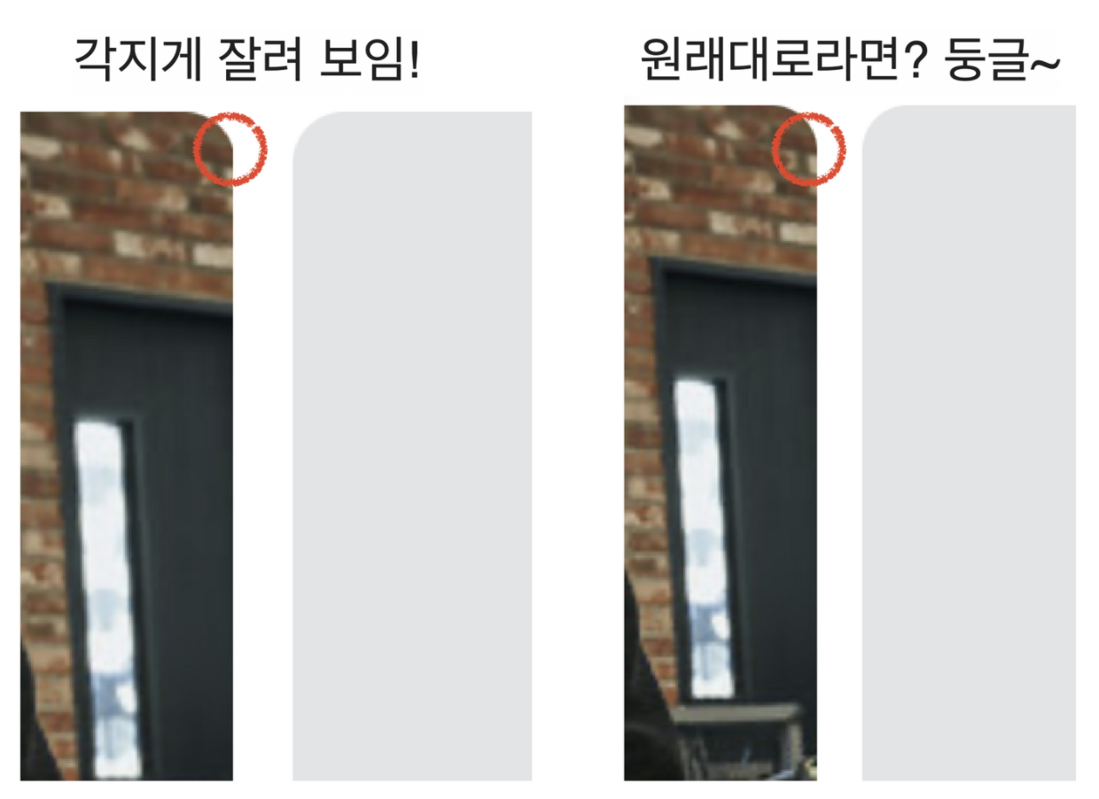 - 아이템 corner 쪽이 각져서 잘려 보여요 → 503(502.5에서 반올림) px에서 cornerRadius가 반영된 상태에서 502px로 줄어들었기 때문입니다.