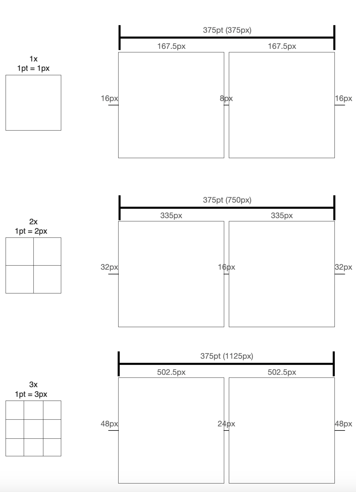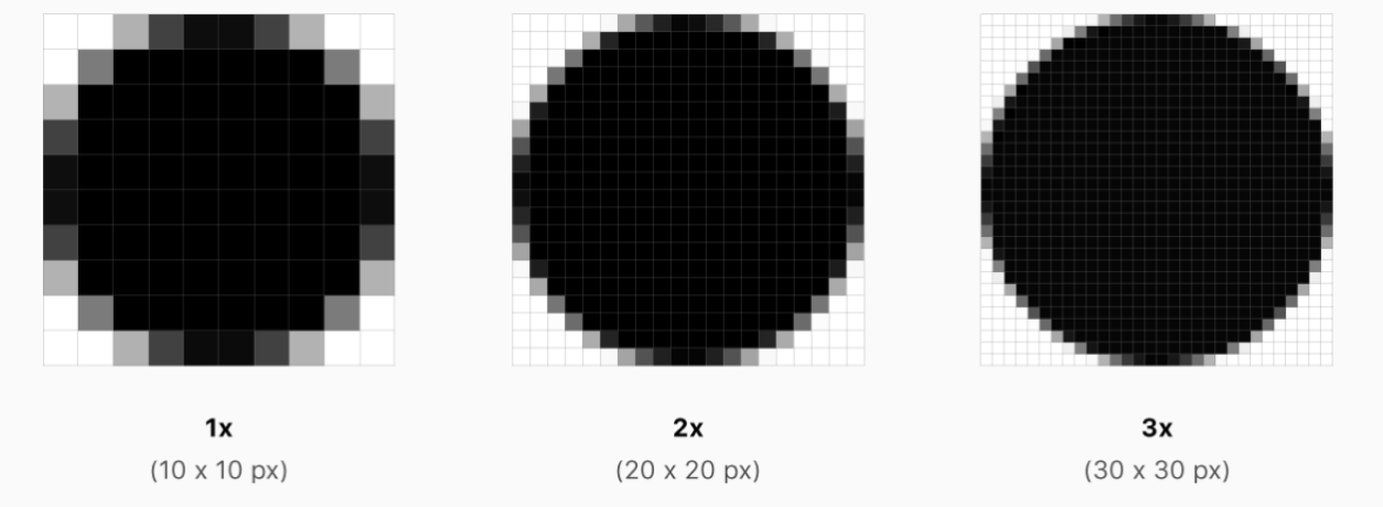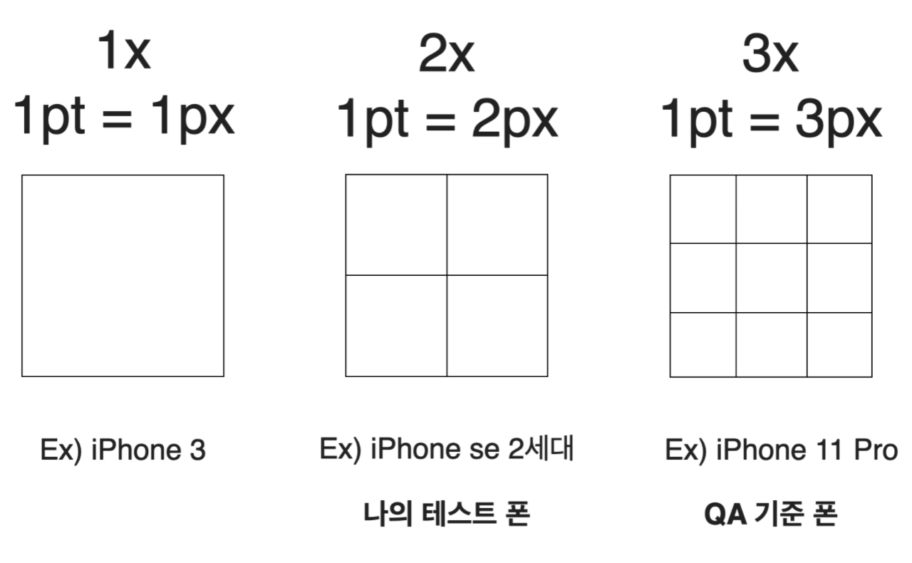 그림과 같이 동일한 1pt에 대해 모여있는 px 수가 다른 것을 확인할 수 있고, iPhone은 기기에 따라 1x, 2x, 3x라는 세 가지 종류의 해상도를 가집니다.