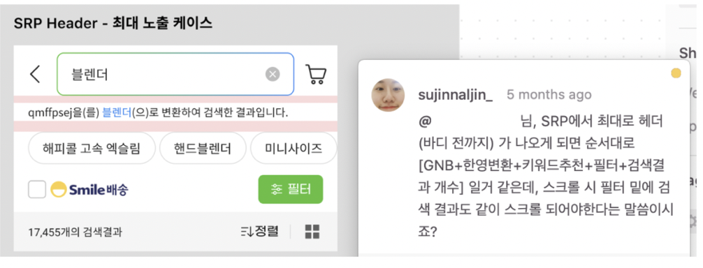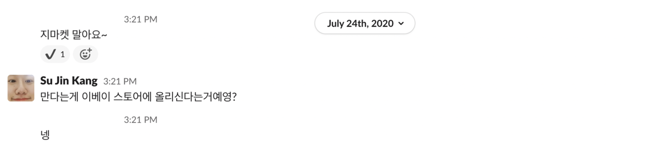 이때는 지마켓용 뷰 모델이 많이 안 나왔을 때라, 기존 옥션용 뷰 모델을 보면서 대충 어떻게 나오겠구나를 우선 파악한 후 개편될 사항과 맞지 않는 부분은 여쭤보고 했습니다. 처음부터 단체 방에 여쭤보기에는 조금 소심한 마음이 들어서 개인적으로 슬랙 드리다가, 다 같이 공유드리는 게 아무래도 맞는 거 같아 슬슬 용기를 내어 단체 슬랙 방에 등장했고요 ㅎㅎ