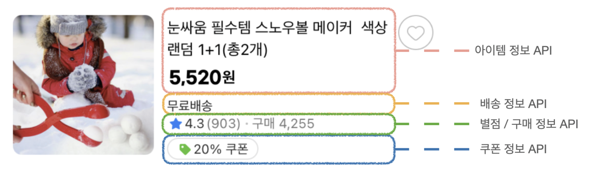 비슷한 개념으로 하나의 아이템 정보를 가져올 때도 DB 연동으로 한 번에 가져오는 것이 아니라, 각각 다른 WG에서 제공하는 API를 써야 하는 상황일 수도 있음을 알았습니다. 물론 사진은 임의로 나눠 놓은 것이지만요.