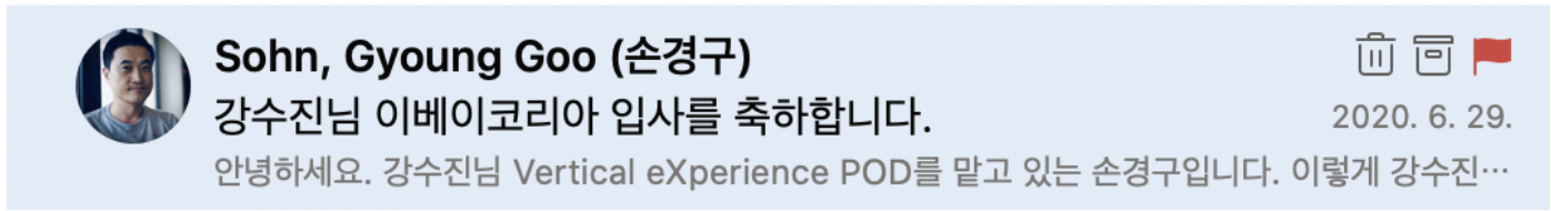 경구님께서 보내 주신 입사 축하 메일도 확인할 수 있습니다.