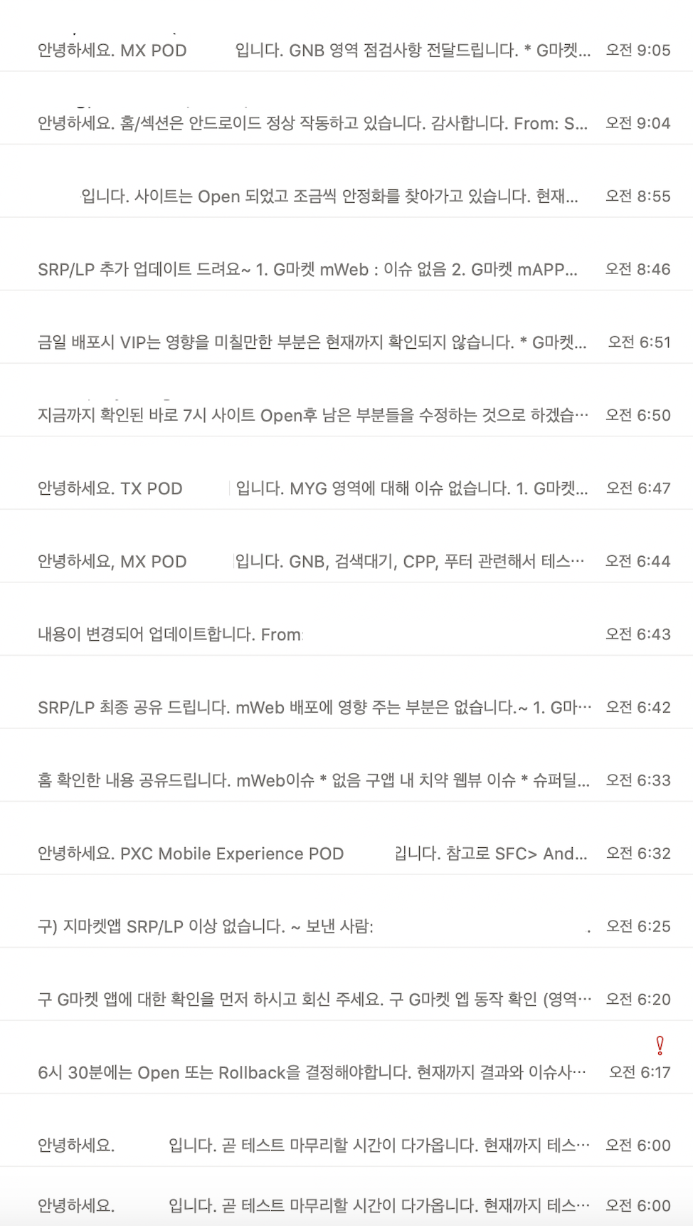 아침에 일어났더니 간밤의 치열한 흔적들이 메일로 남아있었고, 9월부터 3개월 넘게 진행되었던 데일리 미팅 또한 마무리됩니다. 시원 섭섭했어요 ㅠ(사실 오후에도 이슈가 계속 나와서 아침에 딱! 끝난 건 아니지만요)