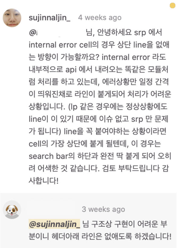 신기했던 것은 저는 디자인이 결정되면 어떻게든 똑같이 구현해야 하는 줄 알았는데, 개발 상황이나 효율에 따라 디자인도 어느 정도 유동적이게 조정 가능하다는 점이었습니다. 그래서 스펙대로 구현이 어려울 때는 디자이너 분도 조정이 필요한 이유를 공감하도록, 안 되는 이유를 최대한 자세히 설명드리고자 했습니다. 또한 디자인 변경이 필요할 것 같으면 안드로이드 개발자 분과 먼저 얘기하는 것도 잊지 않았고요!