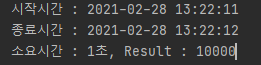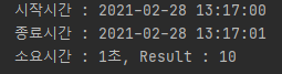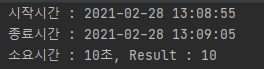 System.out.println(String.format("소요시간 : %d초, Result : %d",diff.getSeconds(), holidaySum));