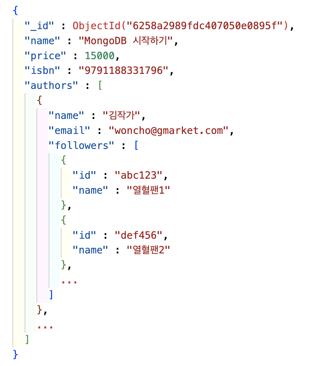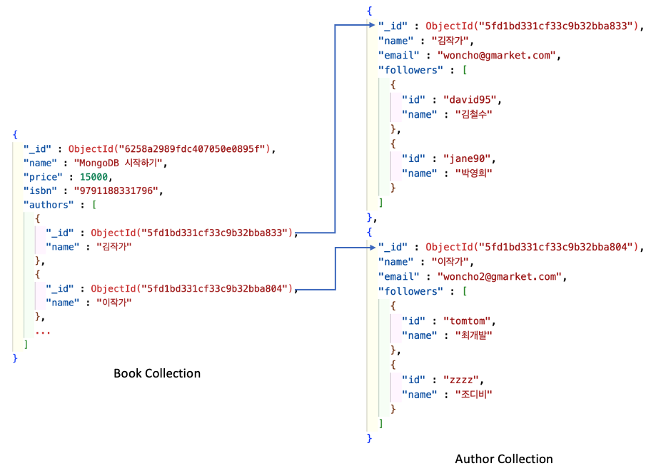 Embedded 모델에 follower 정보를 추가하면 Author 아래에 follower라는 array가 추가되는 형태일 것입니다. 그럼 이제 한 가지 문제가 생깁니다. 이제 한강 작가에게 follower가 추가될 때마다 작가의 모든 저서의 document를 순회하면서 authors array에서 한강 작가에 해당하는 document를 찾고, 이 document의 followers array에 신규 follower 정보를 추가해야 합니다. Follower가 following을 취소할 때 역시 마찬가지로 이런 비효율적인 과정을 통해 follower 정보를 삭제해야 합니다. 이는 Book document에 Author의 모든 속성을 embed 하는 것이 비효율적임을 보여줍니다.