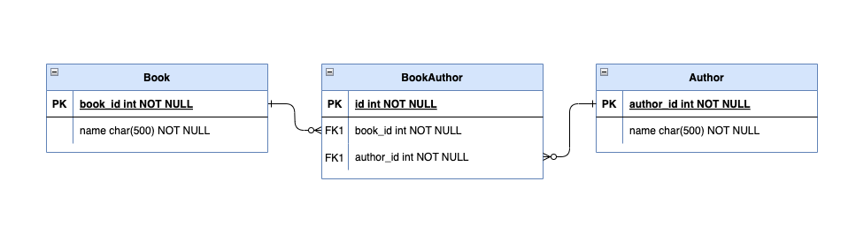 하나의 책에 여러 저자가 참여할 수 있고, 한 저자가 여러 책을 집필할 수 있기에 책(Book)과 저자(Author)는 Many-to-Many의 관계를 갖습니다. RDB의 경우, Book과 Author 사이에 BookAuthor라는 mapping table을 두어, 책과 저자의 다대다 관계를 두 개의 일대다 관계로 설계하였을 것입니다. 이런 RDB 식 설계를 MongoDB 스키마로 옮겨 예제를 시작해보도록 하겠습니다.