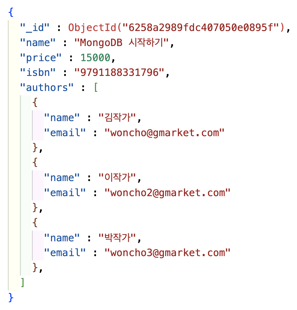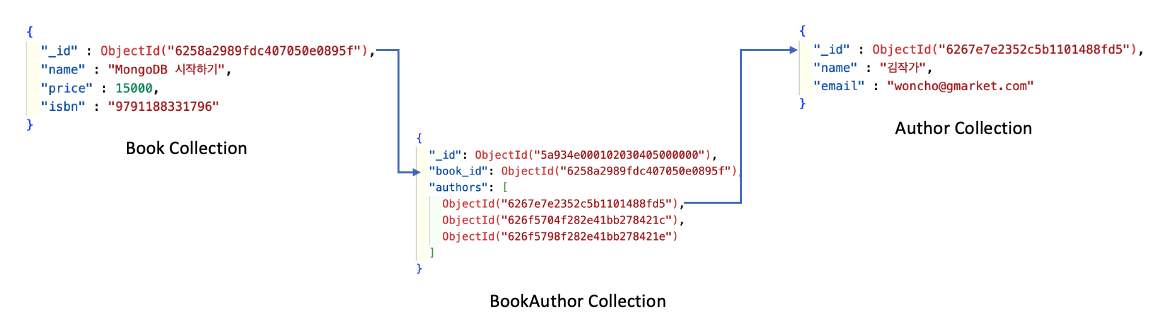 RDB의 설계 철학을 그대로 MongoDB에 적용하였습니다. 각각의 속성(필드)은 하나의 엔티티(컬렉션)에 속해있고, 정규화를 통해 중복되는 데이터는 없습니다. 사실 스키마 자체는 크게 문제 될 요소는 없습니다. 예를 들어, 데이터의 일관성이 중요하고 속도에 크게 신경 쓸 필요가 없다면 이 스키마 그대로 사용해도 상관없습니다. 오히려, 책과 저자 정보가 실시간으로 계속 업데이트되고 있다면 이렇게 정규화한 RDB 스러운 스키마가 더 바람직하다고 할 수 있습니다.