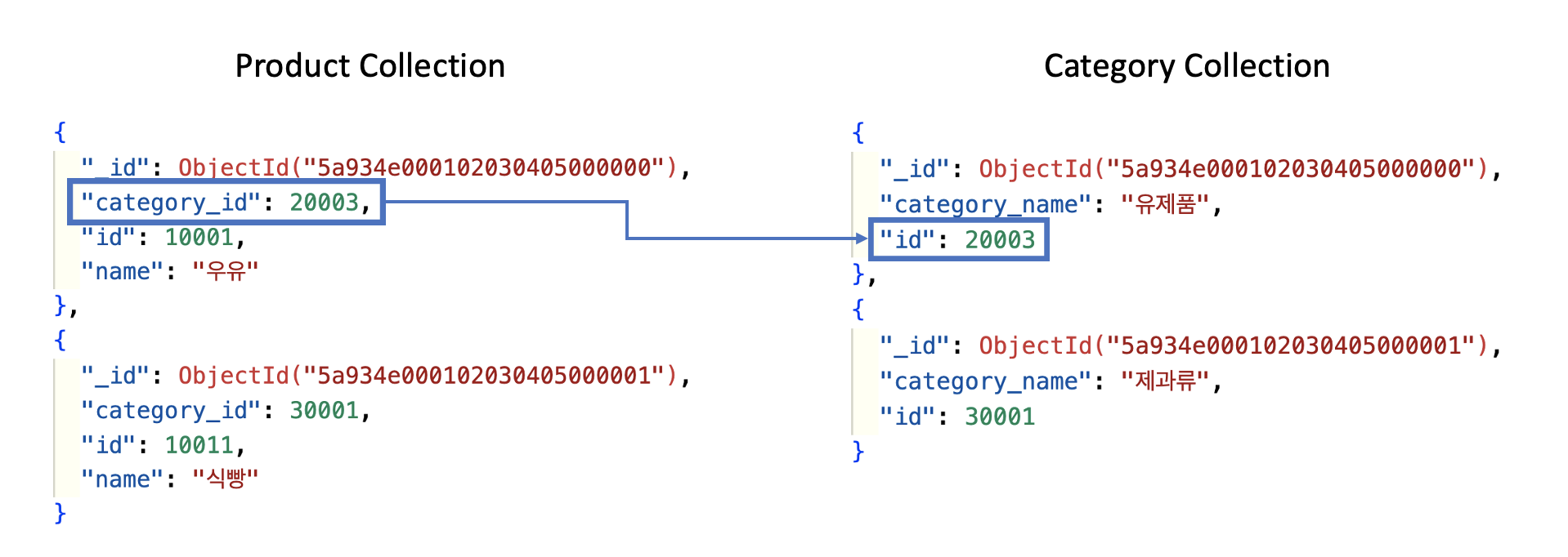 Access Pattern을 분석하여 collection들이 정의되면 이제 collection 간의 관계를 파악합니다. 이커머스 플랫폼을 운영하는 입장에서 Product와 Category라는 두 collection이 DB에 존재한다고 해봅시다. RDB에서는 Product Table에 category_id라는 칼럼을 두어 Category Table과 Join 하여 카테고리 정보를 가져오도록 설계할 것입니다.