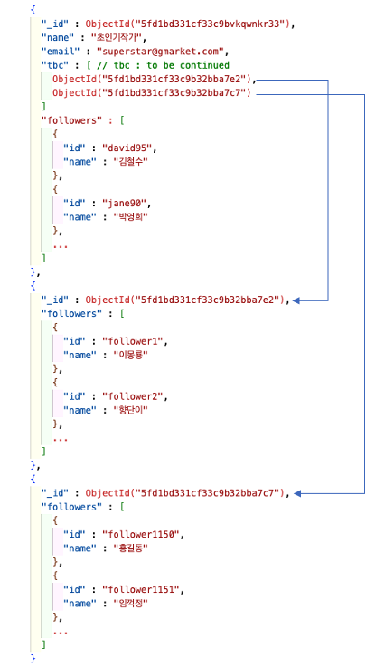 이런 경우, 해당 document가 outlier임을 나타내는 flag를 저장하고(위 예시의 "tbc"), Id를 기준으로 여러 document에 나누어 저장하는 방식으로 설계합니다. 이제 application은 flag가 존재하는 경우에만 추가 query를 수행하여 follower 정보를 가져오게 됩니다. 이로써, 우리의 북스토어 서버는 필요한 상황에 필요한 만큼만 데이터를 가져오도록 최적의 스키마를 갖추었습니다.😎