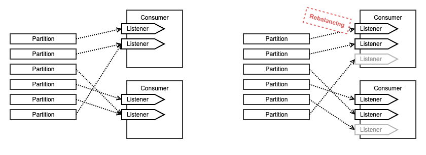 하지만 이 방법도 리밸런싱을 피할 수 없습니다. 특히나 늘어난 트래픽을 대응하기 위해 컨슈머를 더 투입하는 순간 되려 리밸런싱을 위해 모든 컨슈머가 읽기를 멈출 것입니다.