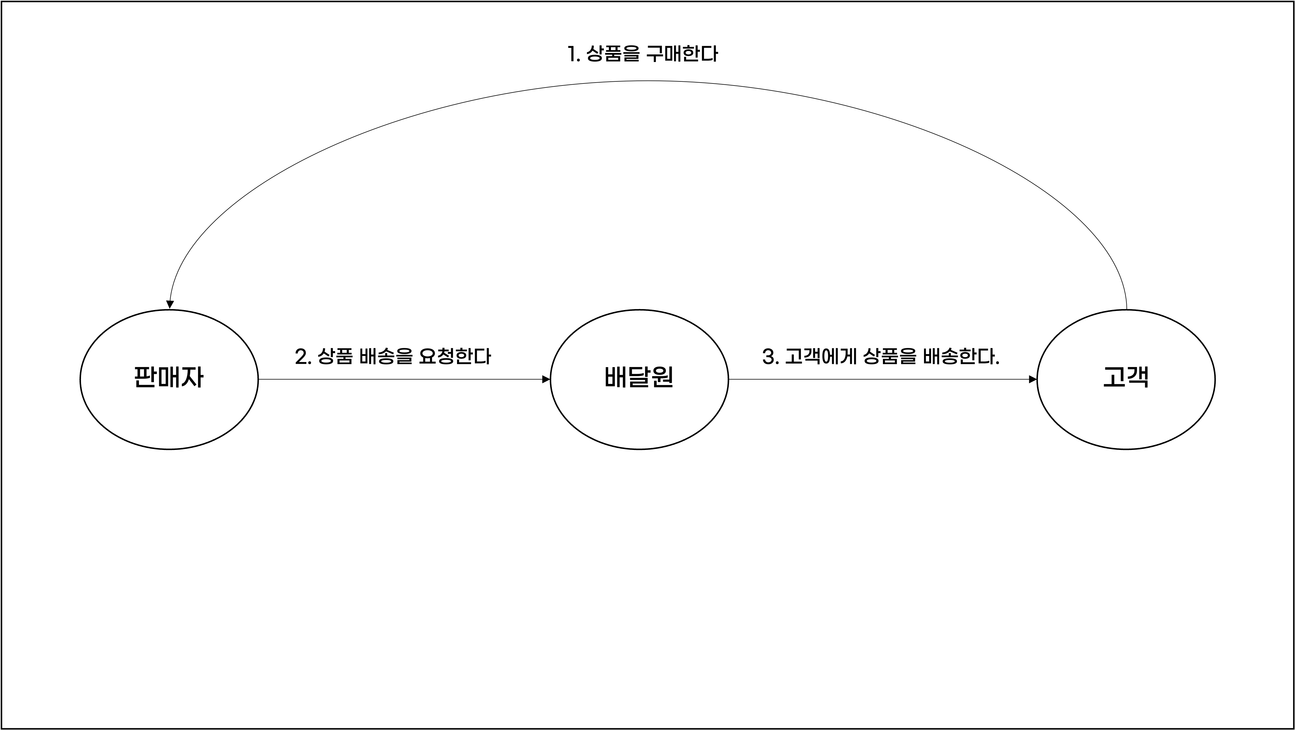 객체도 찾지 않았는데 객체들의 관계에 주목하자니 의아할 수 있지만 예시를 통해 설명드리겠습니다. 우선 사진 속 상황에서 목표를 찾자면 "배송"일 것입니다. 이러한 목표가 달성되기 위해서는 많은 행동들이 필요합니다. 고객은 판매자의 상품을 구매해야 하고, 판매자는 해당 상품을 배달원에게 배송 요청해야 하고, 배달원은 고객에게 해당 상품을 전달해야 합니다. 정말 단순하게 표현해봤지만, 어떠한 목표가 생기면 목표를 달성하기 위한 행동들이 생기고 자연스럽게 행동을 수행할 주체인 객체들이 식별됩니다.