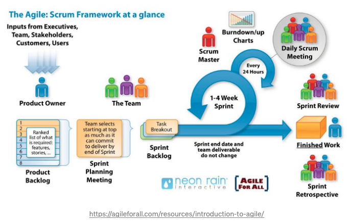 '스프린트'라고 불리는 작업 단위를 사용하여 세분화된 항목에 초점을 맞추고 평균 2주 정도의 기간을 목표로 설정합니다.