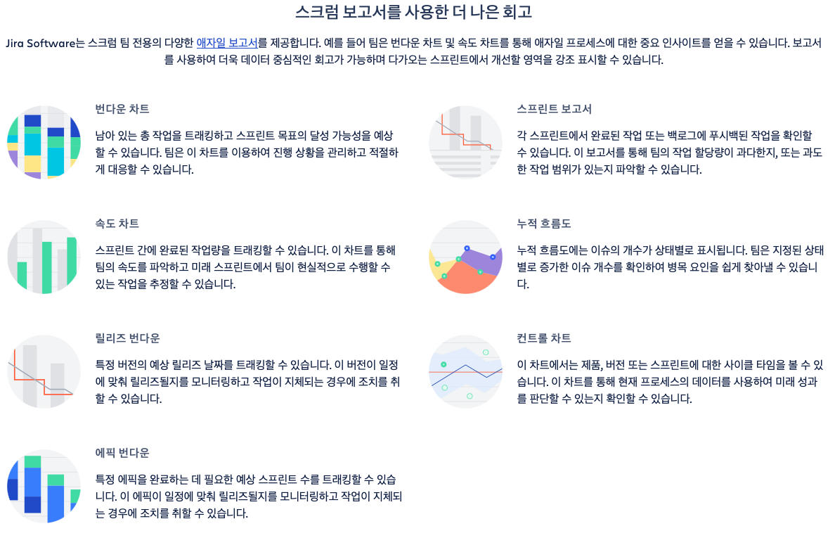 JIRA에서는 애자일 보고서를 위한 다양한 차트를 제공하고 있습니다. 아직 저는 이 부분에 대해서 제대로 활용해보진 못했지만 추후 더 나은 프로젝트 관리를 위해 필요하다고 생각되어 공부하고 있습니다.