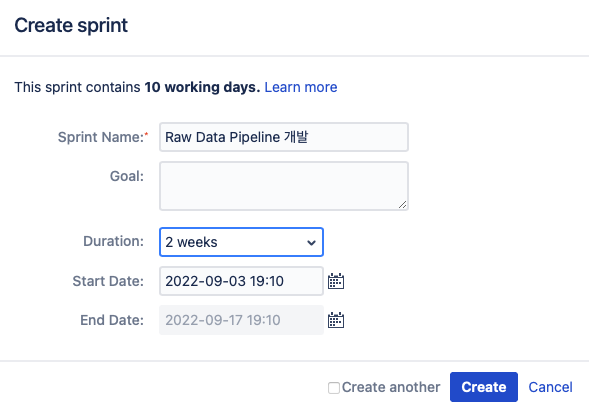 관련 있는 백로그들을 묶어서 'Create Sprint' 버튼을 누르게 되면 스프린트 설정이 나오는데, 위에서 언급한 것처럼 Story 인 'Raw Data Pipeline 개발'을 스프린트의 이름으로 명시하였습니다.