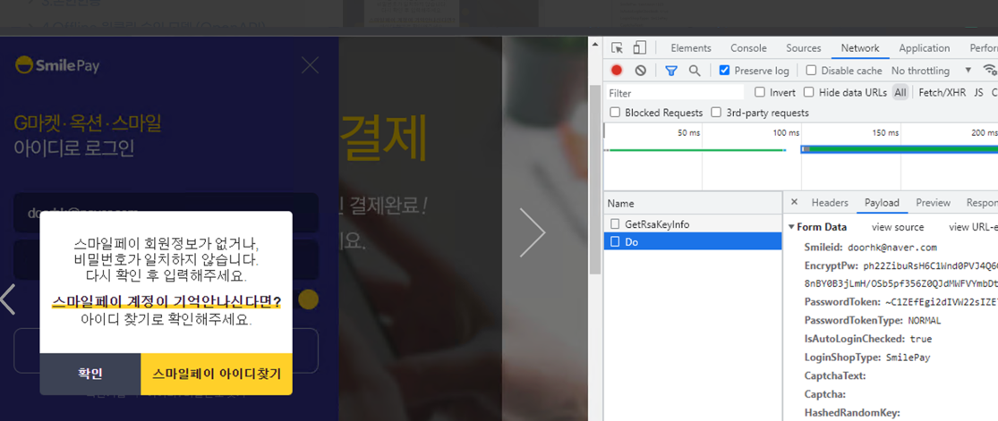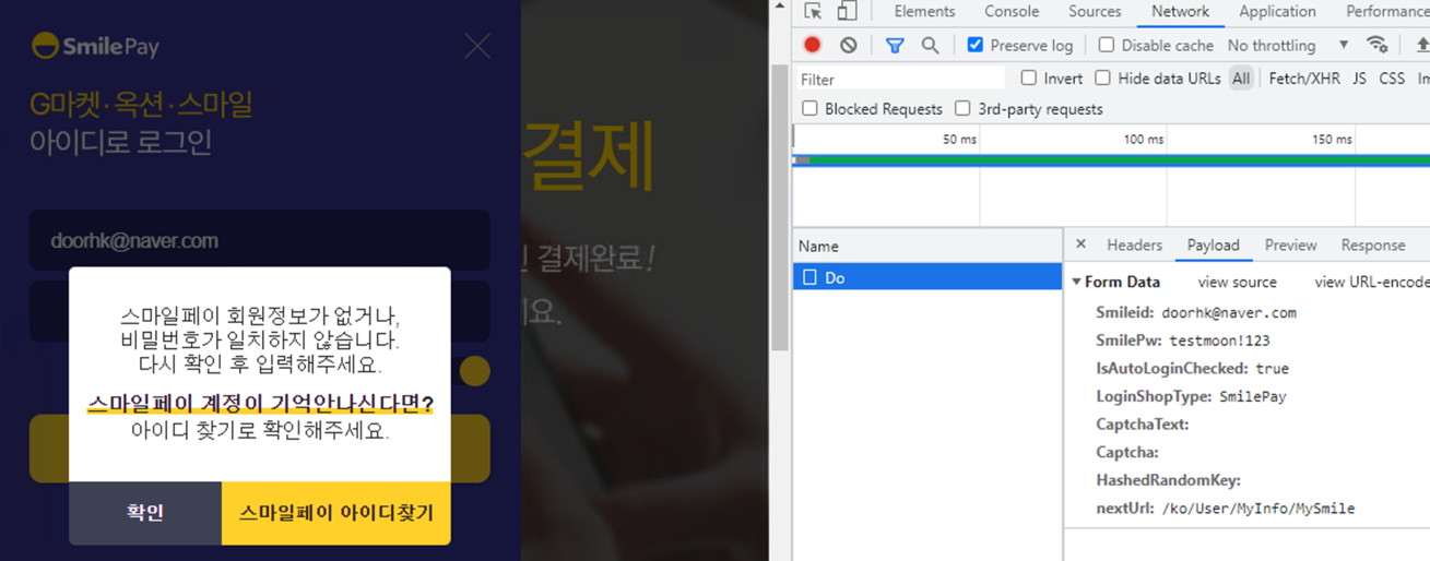 로그인 버튼을 눌렀을 때 개발자 도구 네트워크 탭에 찍힌 것과 같이 비밀번호(SmilePw) "testmoon!123" 이 평문으로 노출됩니다.