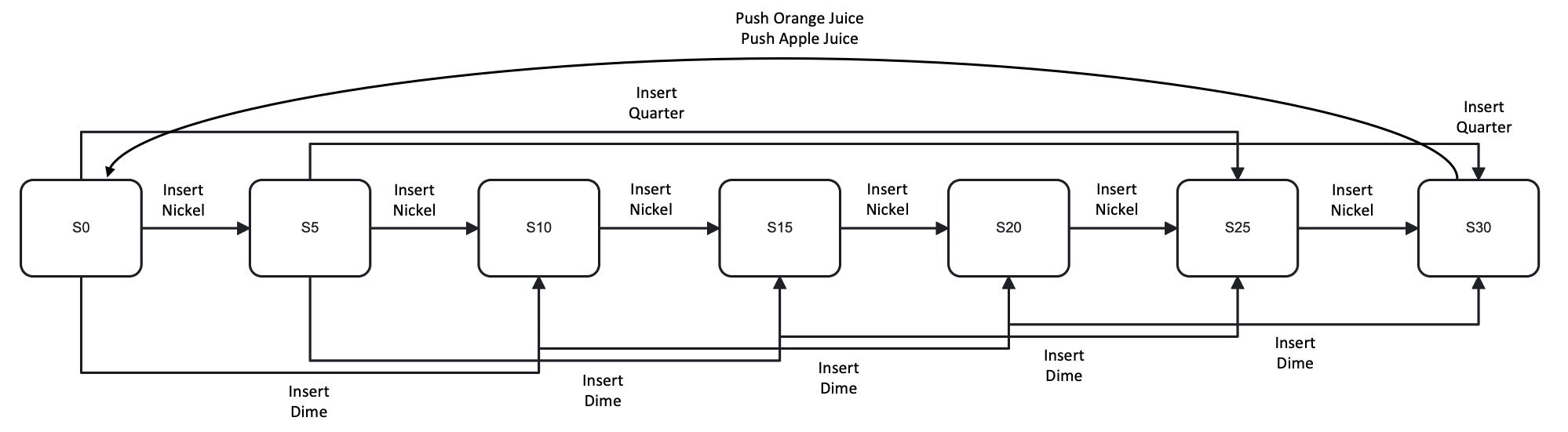 약간 특이한 자판기가 있습니다. Nickel(5¢, 센트), Dime(10¢), Quarter(25¢) 세 종류의 동전만 넣을 수 있고, 상품은 사과 주스와 오렌지 주스뿐이며 가격은 각각 30센트입니다. 그리고, 거스름 돈 기능이 없어서 30¢까지만 동전 투입이 가능합니다. 예를 들어, 25¢가 이미 들어있는 상태에서는 Nickel(5¢) 동전만 투입할 수 있습니다. Dime이나 Quarter 동전을 넣는다면 그대로 뱉어냅니다.