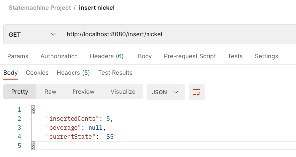 먼저, InsertNickel 이벤트를 발생시켰습니다. 초기 상태(S0)에서 Nickel(5¢)이 투입되어 아래와 같이 동작합니다. 앞서 정의한 ResponseModel 객체를 반환하여, 세 가지 정보(현재 투입금액, 음료수, 상태)를 확인할 수 있습니다.