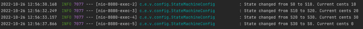다양하게 제공되는 리스너들을 이용할 수 있습니다. 상태가 전이된 경우, 이전 상태와 전이된 상태를 log로 남긴다면 개발에 큰 도움이 될 것입니다. StateMachineConfig 클래스에서 아래와 같이 Listener를 등록합니다. 위의 그림처럼, 다양한 시점에서 동작하는 리스너가 제공됩니다. 상태 전이가 완료된 후(stateChanged), 이전 상태에서 벗어나는 시점(stateExited), 상태 전이가 시작되는 시점(transitionStarted) 등의 리스너들이 등록할 수 있습니다.