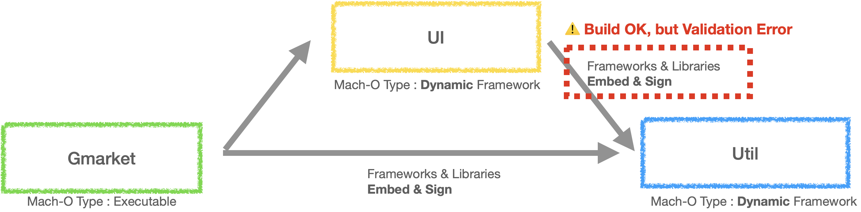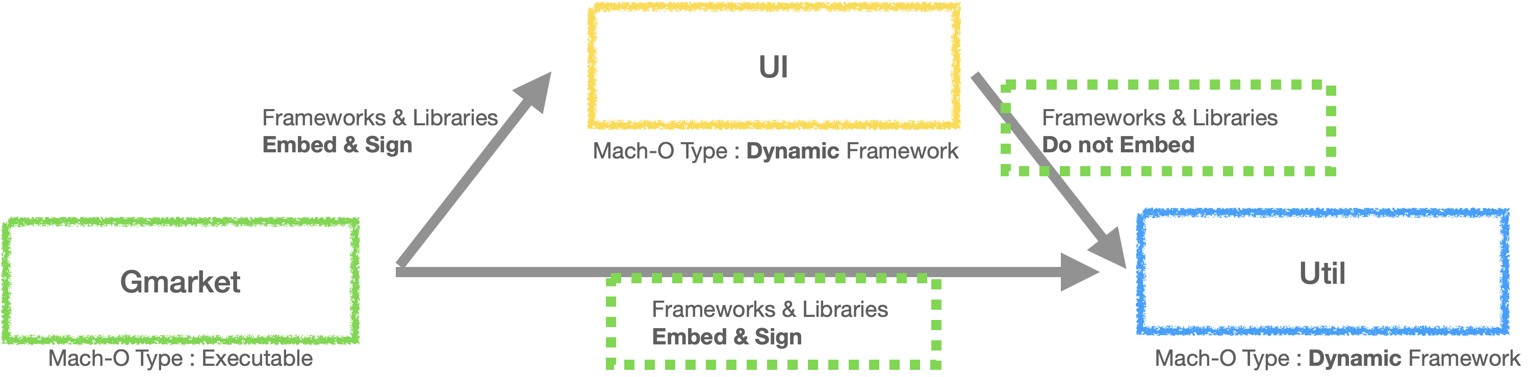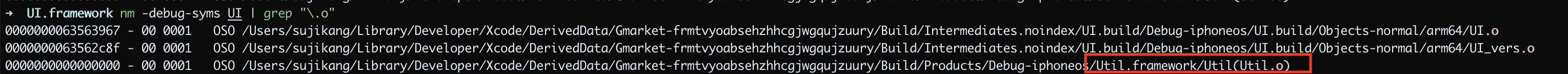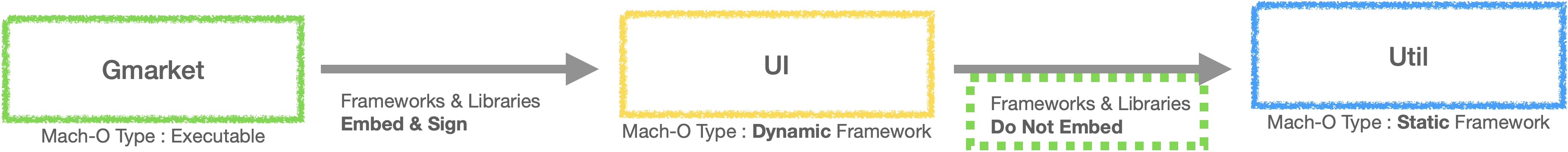 Util 을 Gmarket 에서 Embed 로 명시하지 않고, UI 에서는 Do Not Embed 로 설정한 이유는 Util 이 Static framework 이기 때문입니다. Util 에 대한 .o 파일들이 어차피 UI 의 executable binary 에 포함이 되어있기 때문에 (nm -debug-syms 을 통해 확인 가능) Util 을 굳이 Embed & Sign 할 필요 없습니다.