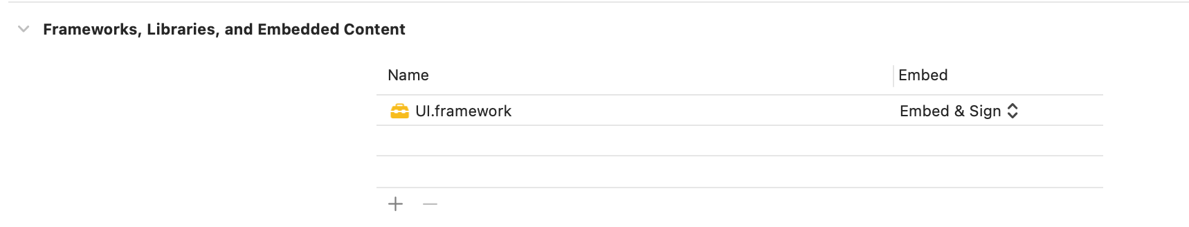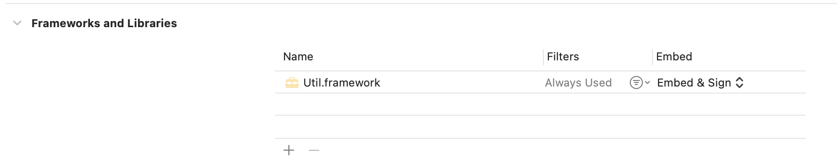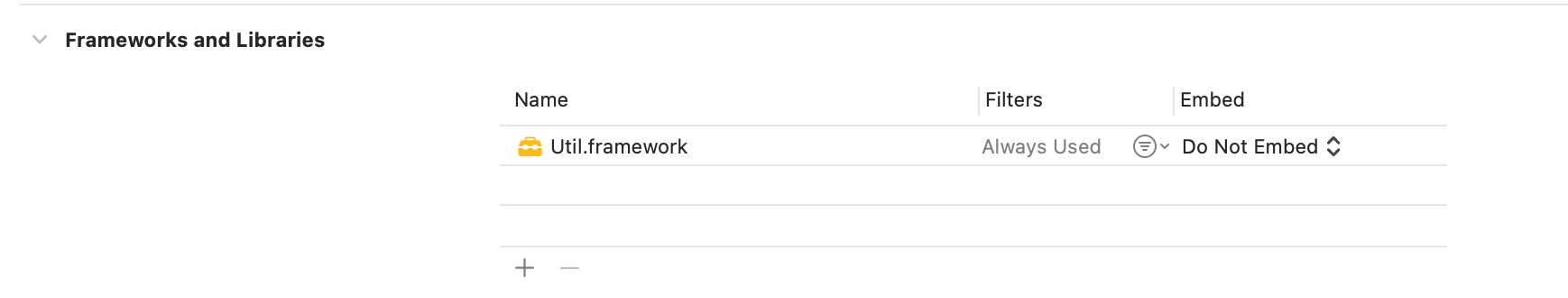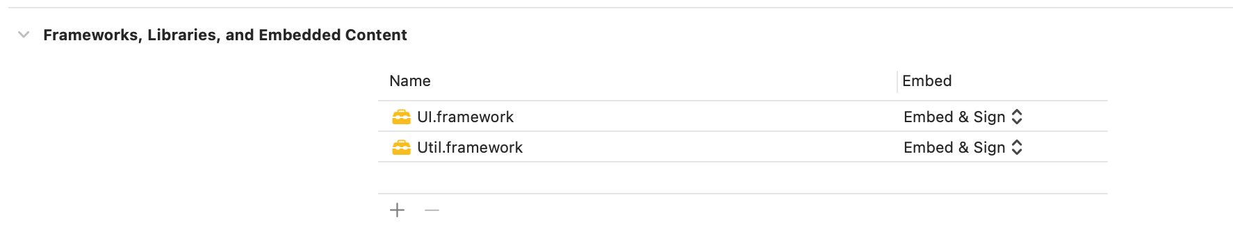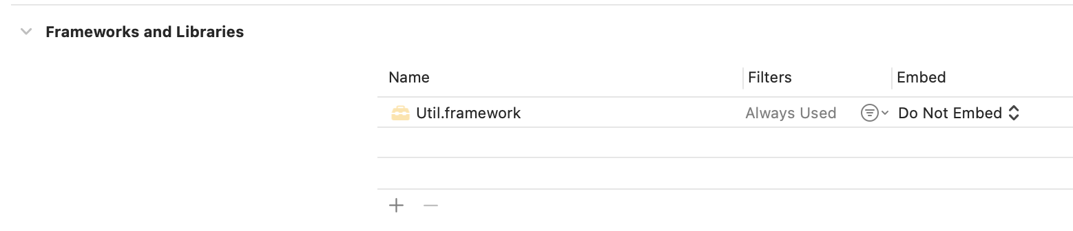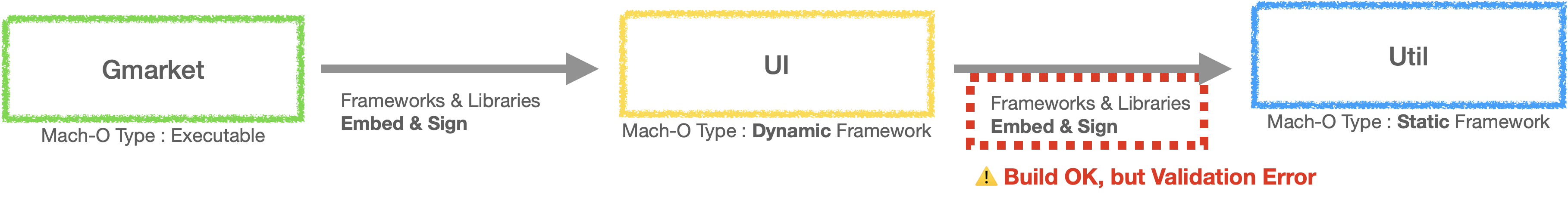 Util 을 Gmarket 에서 Embed 로 명시하지 않고, UI 에서는 Do Not Embed 로 설정한 이유는 Util 이 Static framework 이기 때문입니다. Util 에 대한 .o 파일들이 어차피 UI 의 executable binary 에 포함이 되어있기 때문에 (nm -debug-syms 을 통해 확인 가능) Util 을 굳이 Embed & Sign 할 필요 없습니다.