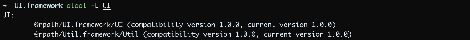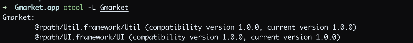 다음으로 UI 프레임워크에서 사용 중인 shared library 의 목록을 프린트해보겠습니다. 마찬가지로 @rpath 에 있는 Util 과 UI 를 사용하고 있네요