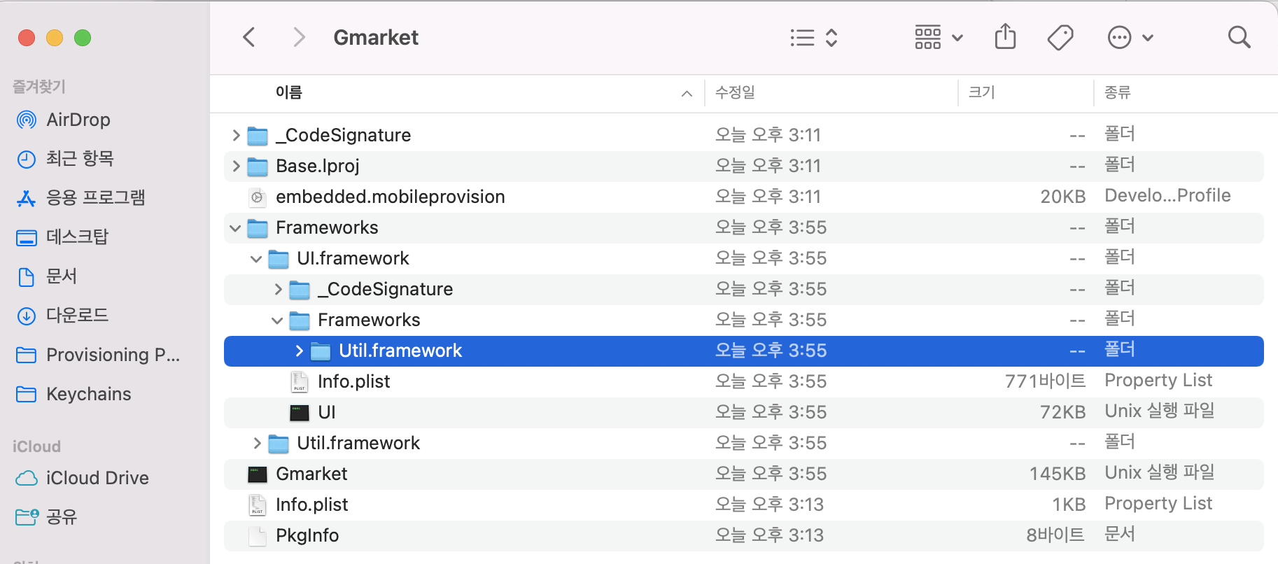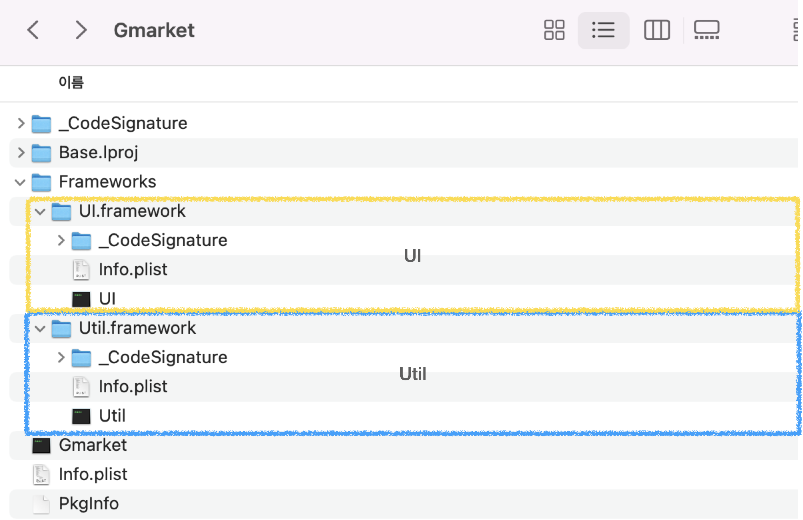 이렇게 빌드를 하고 Gmarket.app 패키지 내용을 보면 Frameworks 폴더 하위에 Gmarket에서 Embed & Sign 으로 설정한 UI, Util 프레임워크가 있는 것을 볼 수 있습니다.