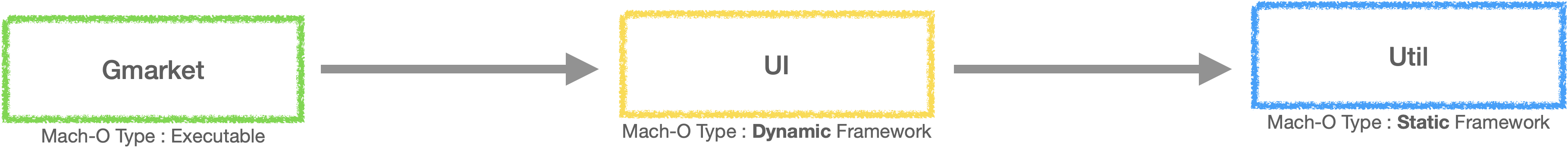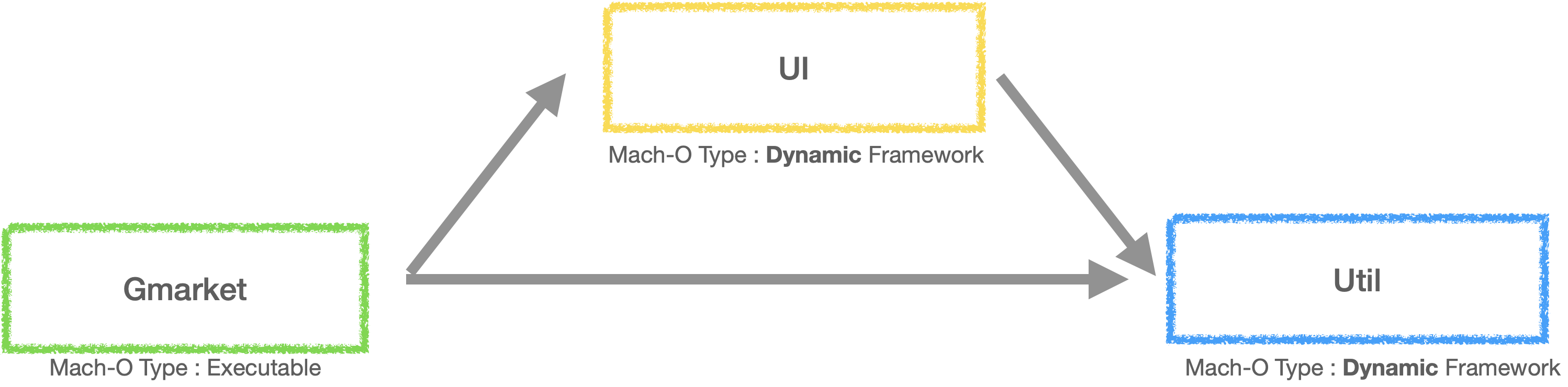 이번 글에서는 지마켓 iOS 프로젝트에서 사용하고 있는 프레임워크들의 관계와, Framework 에서 다른 Framework 를 사용할 때 Mach-O type 에 따른 주의 사항을 알아보겠습니다.