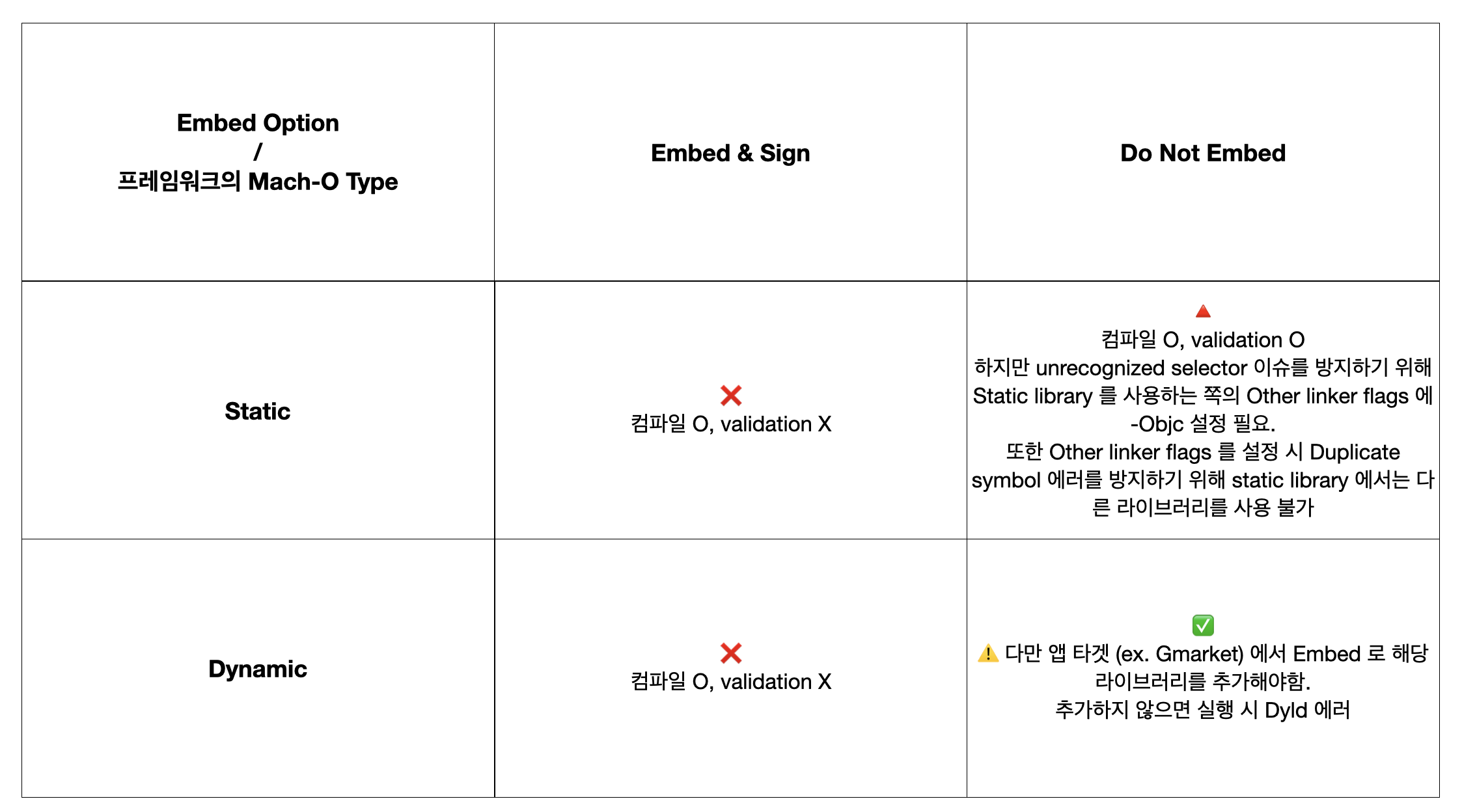 결론적으로 Framework 안에서 다른 Framework 를 사용할 때는 Embed Option 은 Do Not Embed 로 설정해야하며, 사용하고자 하는 다른 프레임워크의 Mach-O 타입이 Static 이냐 Dynamic 이냐에 따라 아래와 같은 주의 사항이 있습니다.