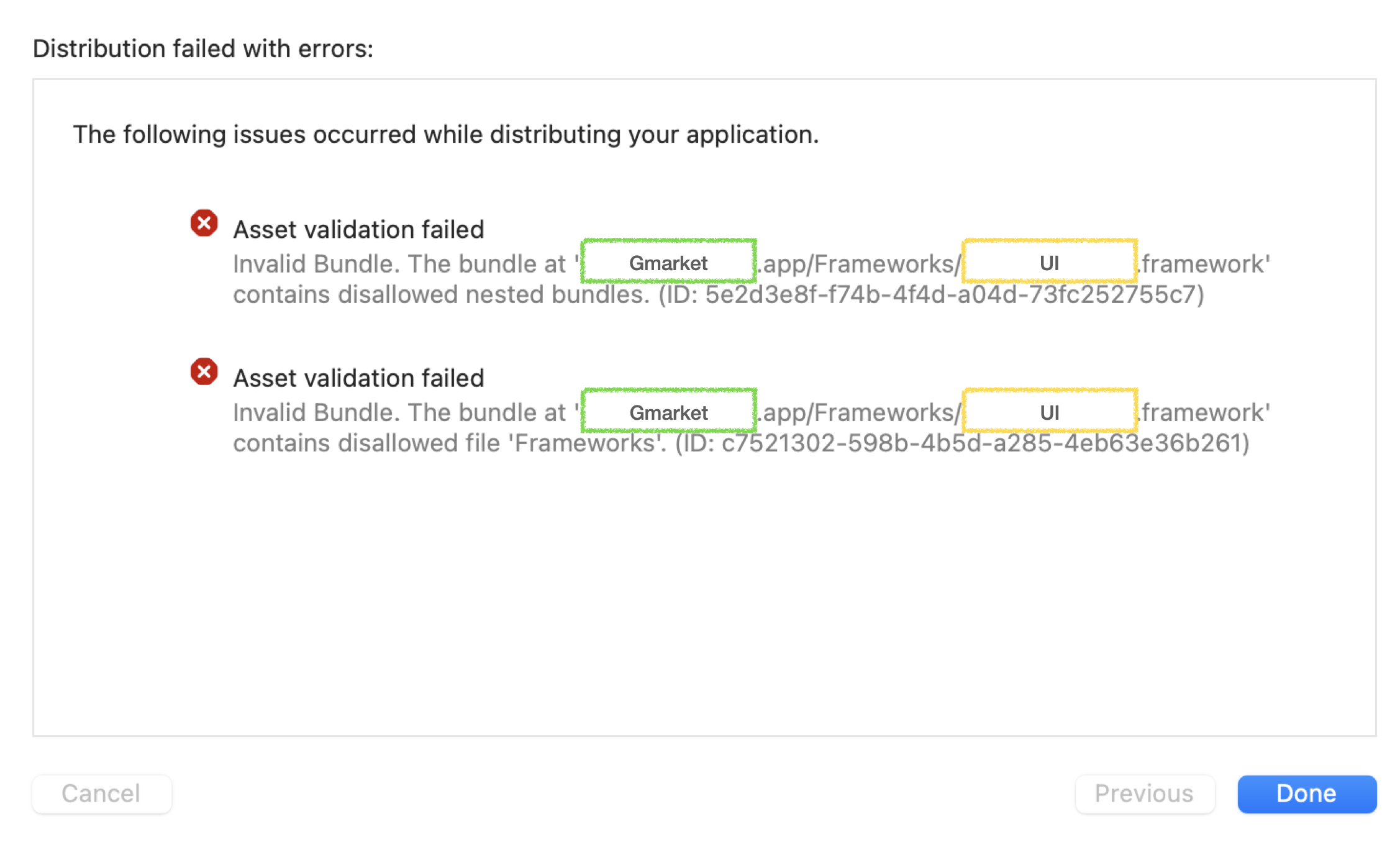 빌드는 잘 되지만 Archive 후 아래와 같은 Validation Error 가 발생합니다.