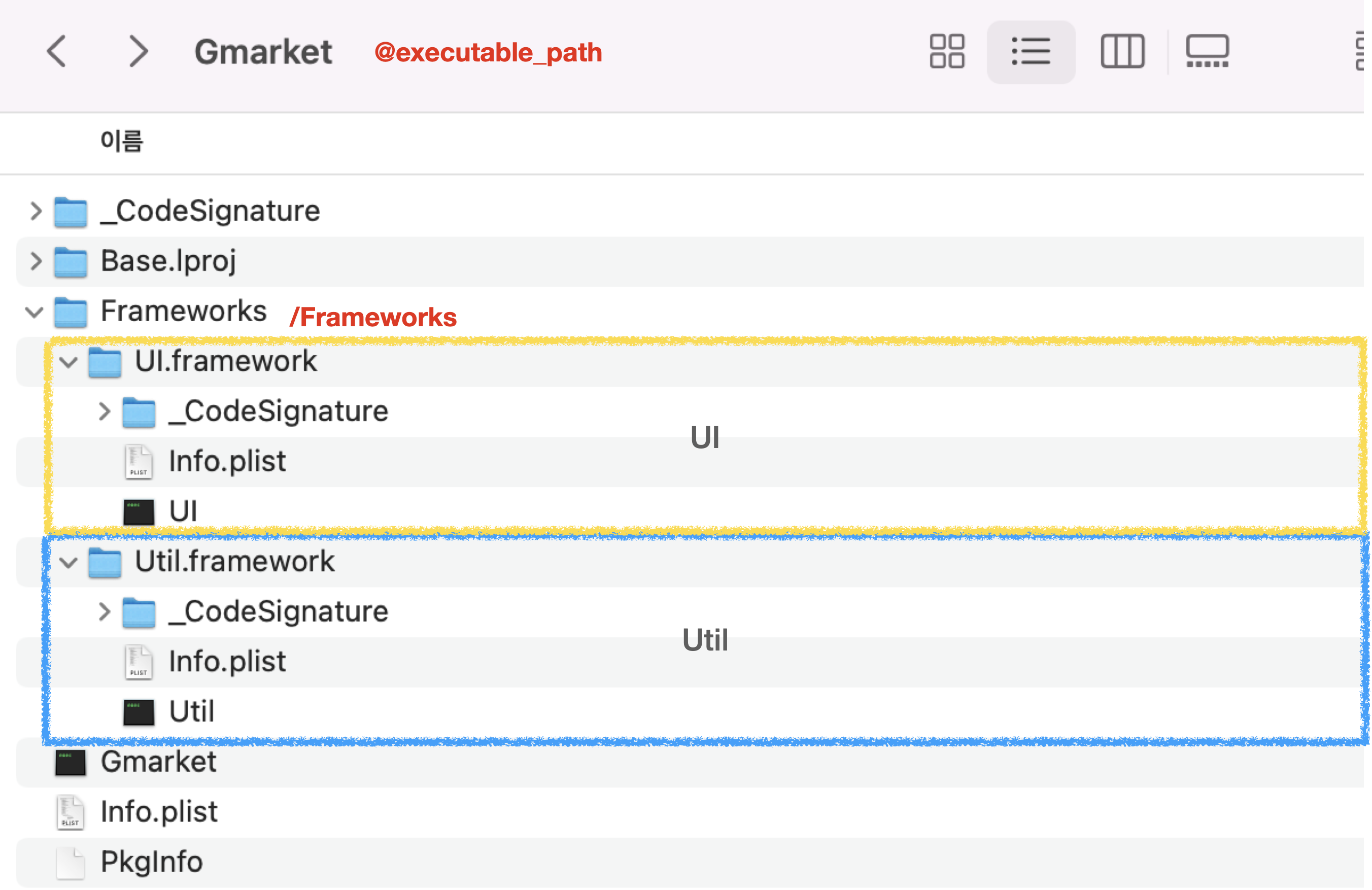 최종적인 폴더의 구조는 /Gmarket.app/Frameworks/UI.framework/Frameworks/Util.framework/Util 처럼 UI 프레임워크 하위에 Util 이 들어가는 형태가 될 텐데요,