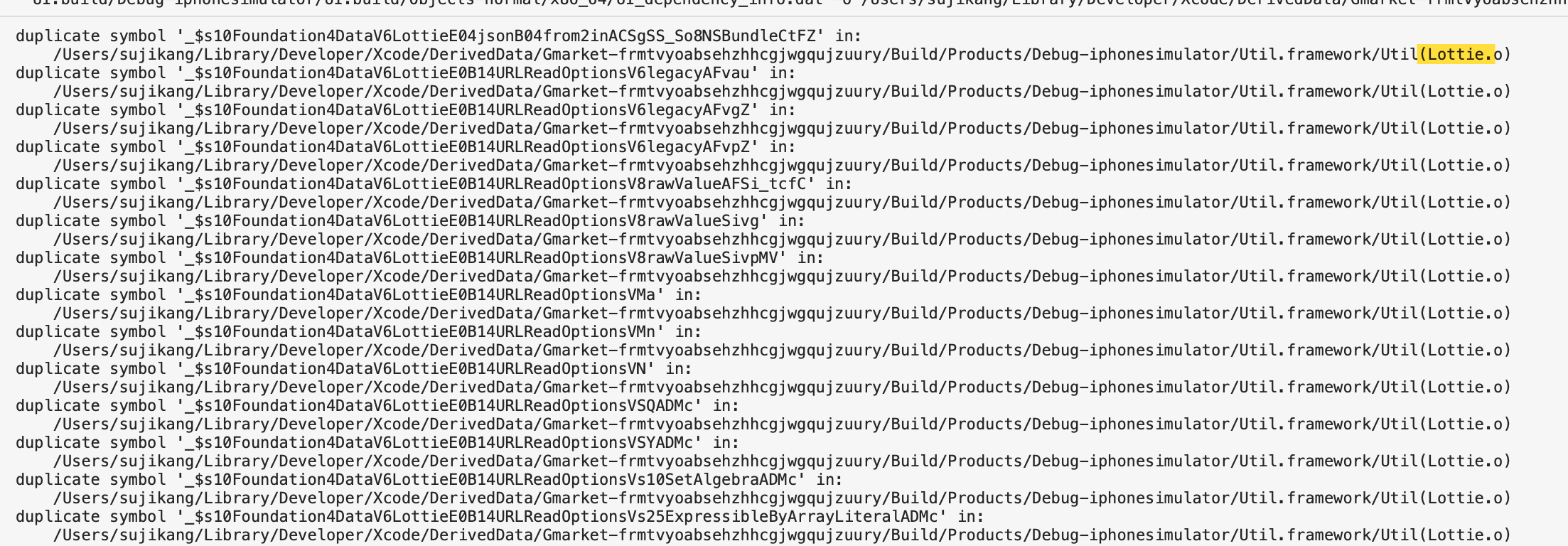 하지만 Util 은 현재 Lottie 와 같은 framework 를 SPM 으로 사용하고 있었는데요, 만약 UI framework에서 -Objc 플래그를 설정하면 Util 의 SPM 으로 명시해둔 Lottie 같은 프레임워크들에서 Duplicate symbols 에러가 발생했습니다.